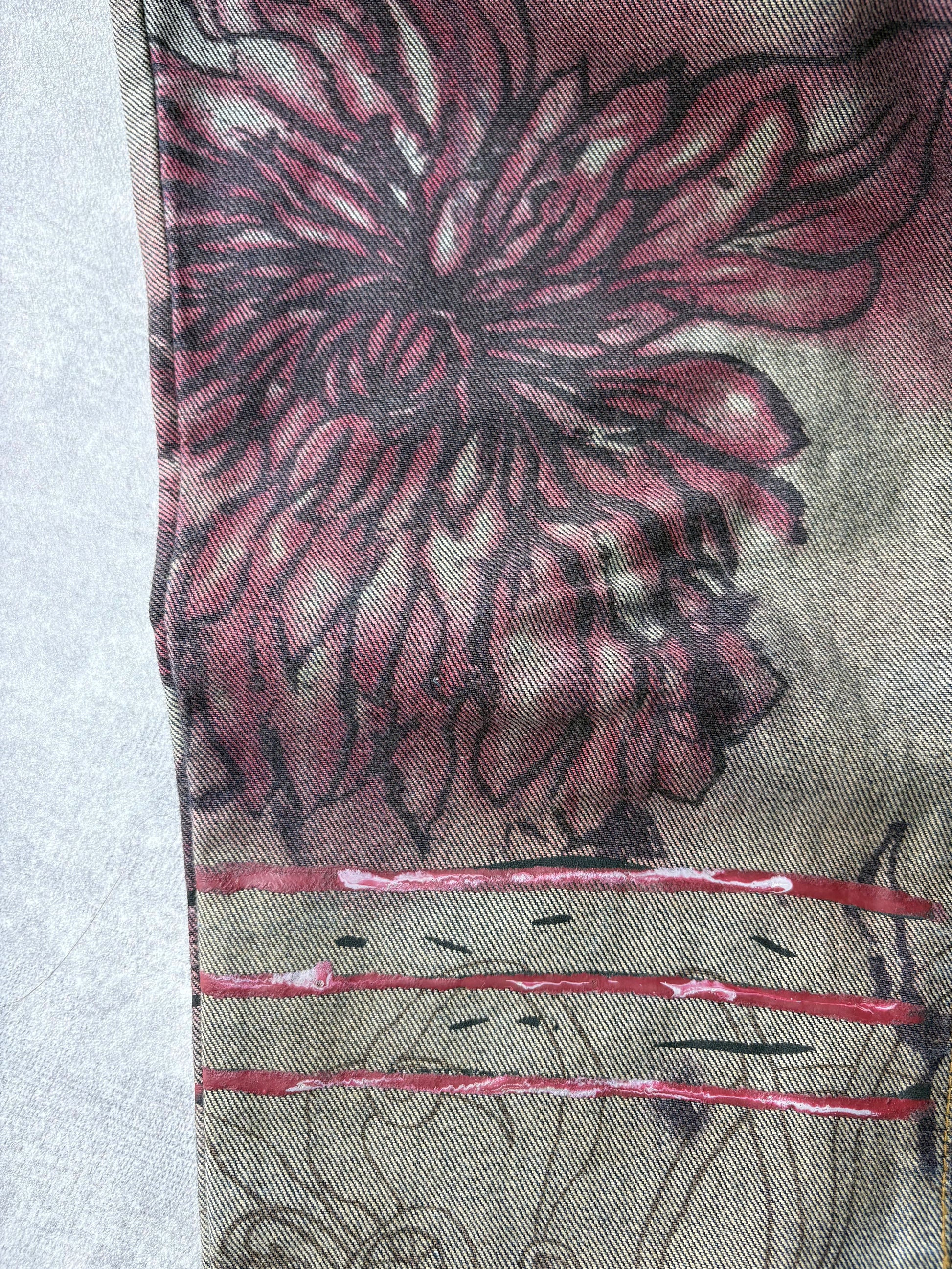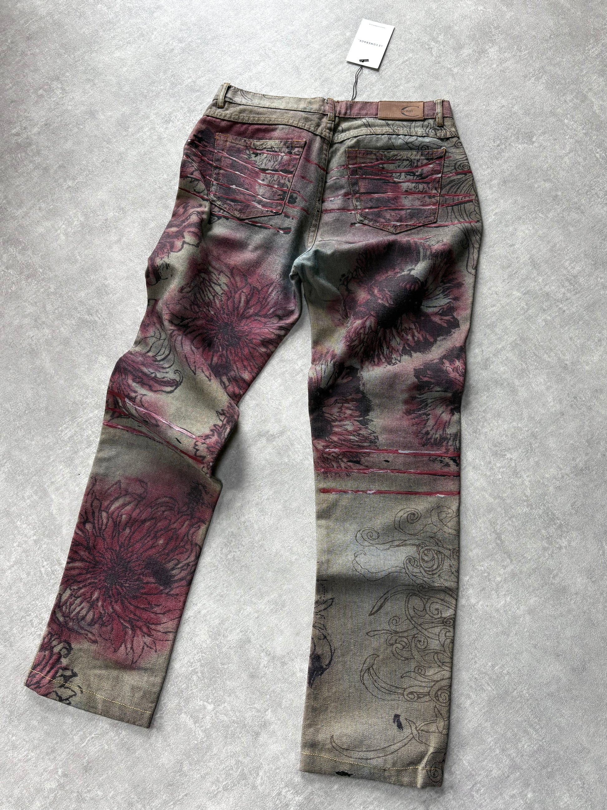 Vintage early 2000s Just Cavalli jeans with painted slash detailing and floral print. Slight distressed effect.