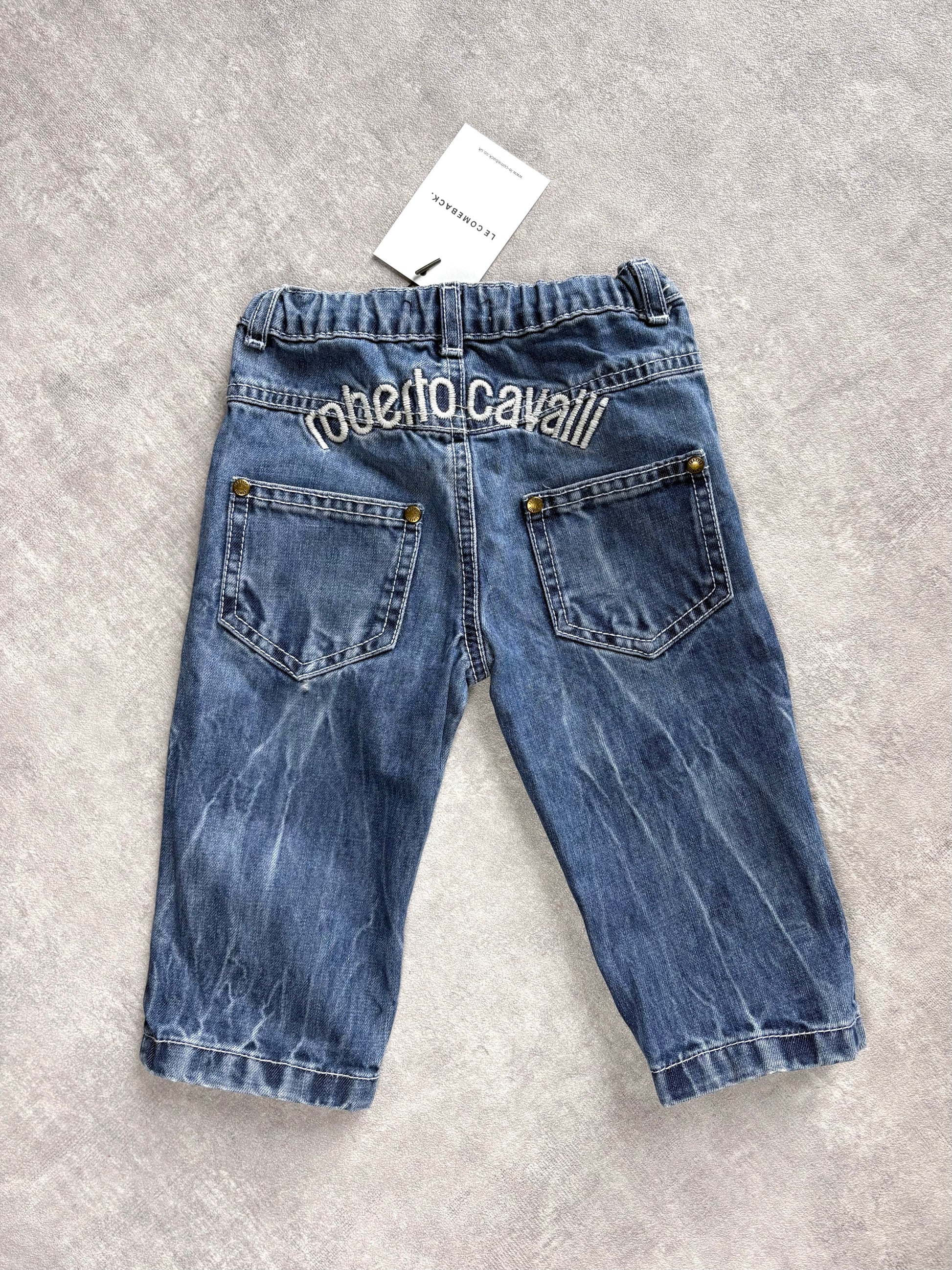 Vintage Cavalli jeans with embroidered logo to the back. Distressed, acid wash finish. Gold engraved hardware.