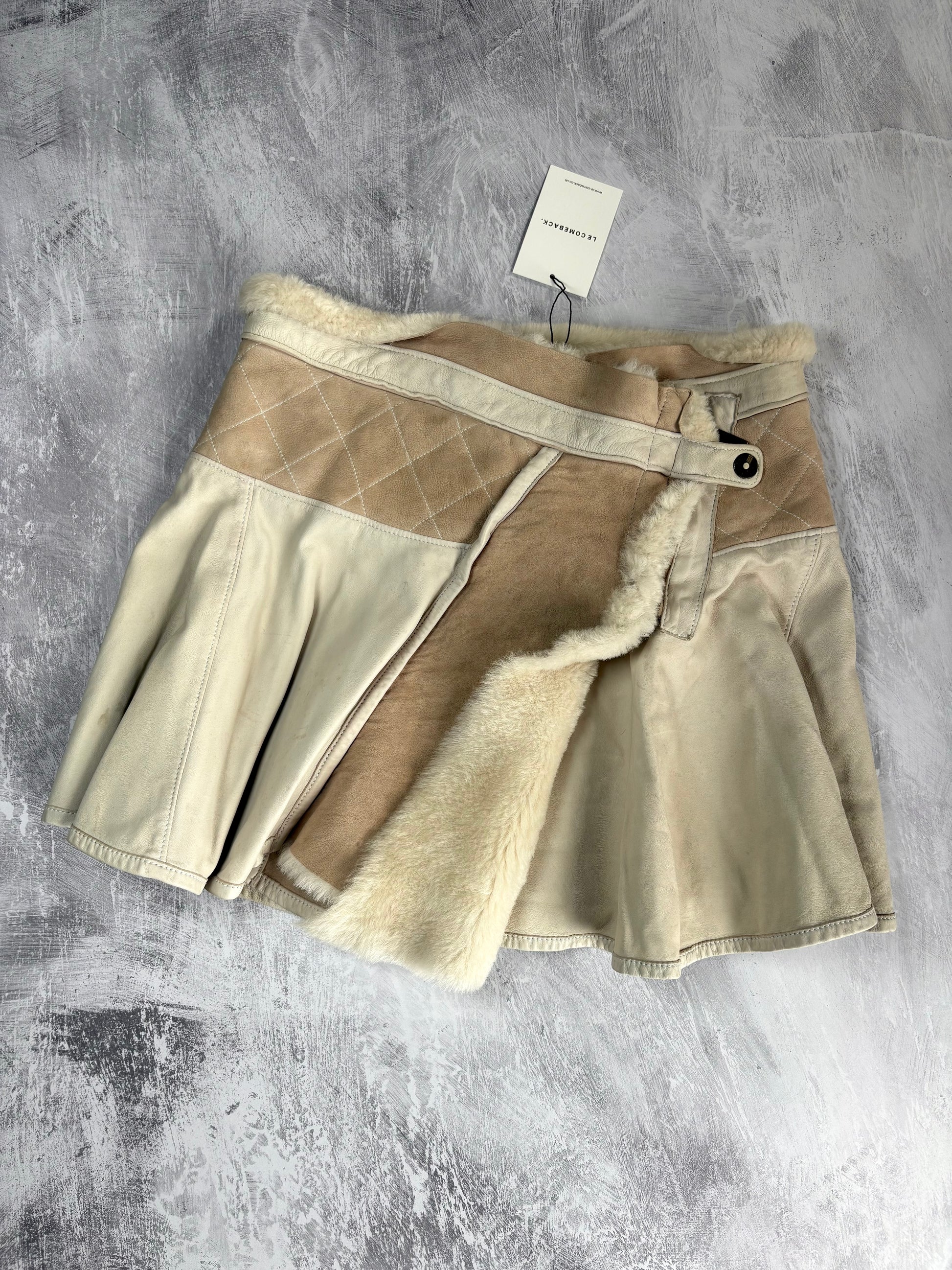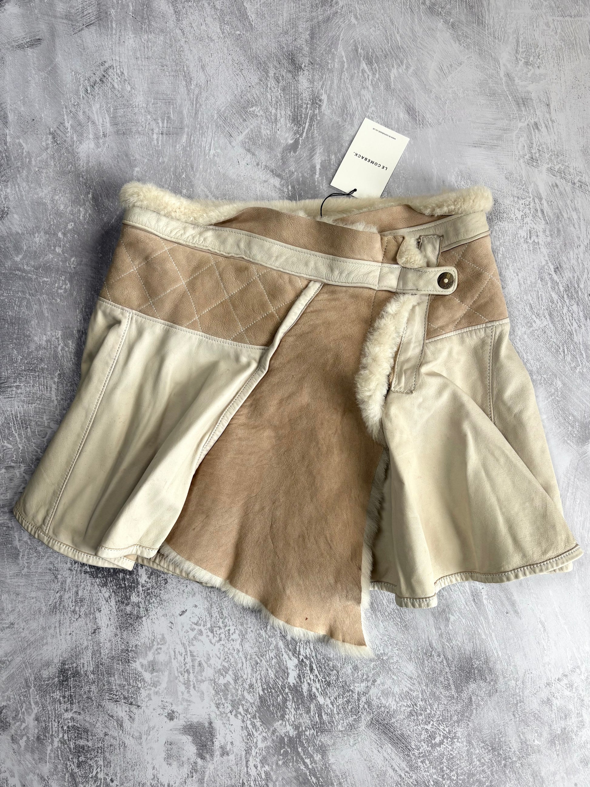 Rare vintage Just Cavalli wrap skirt with quilted suede, leather and shearling. Asymmetric zip and button closure.