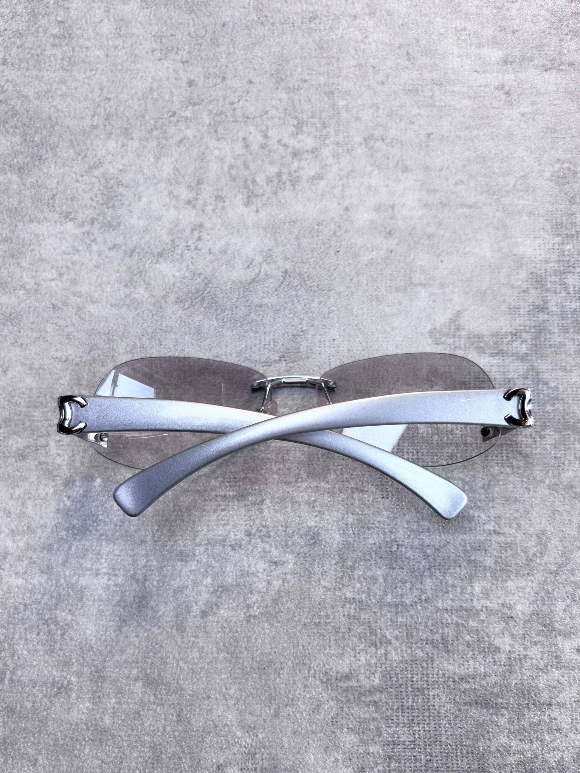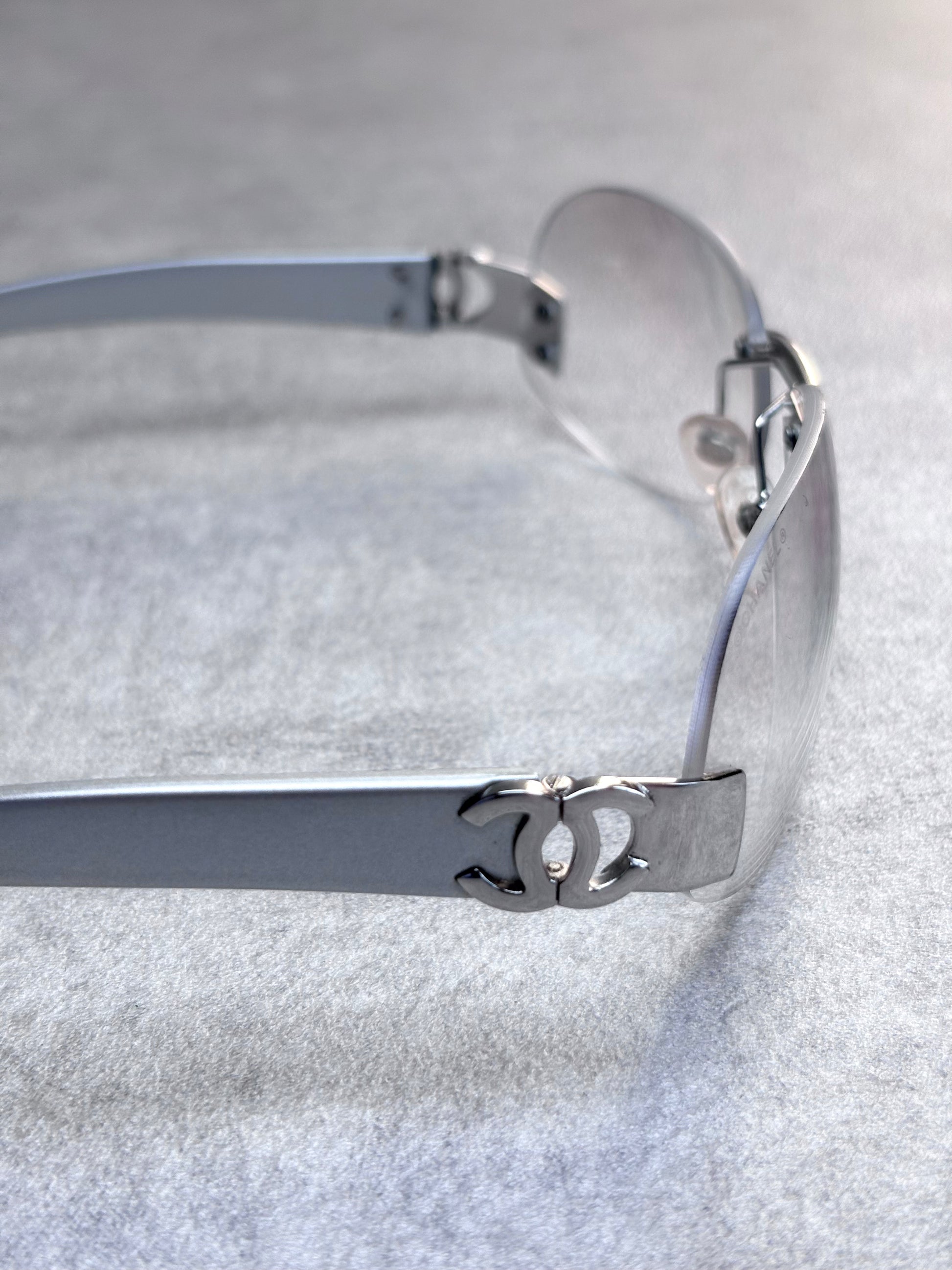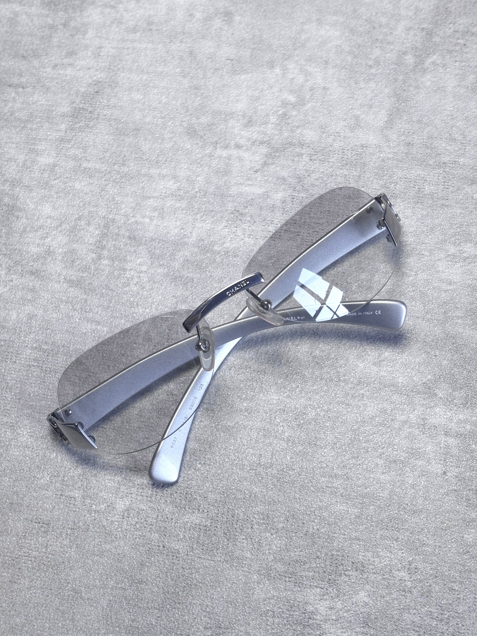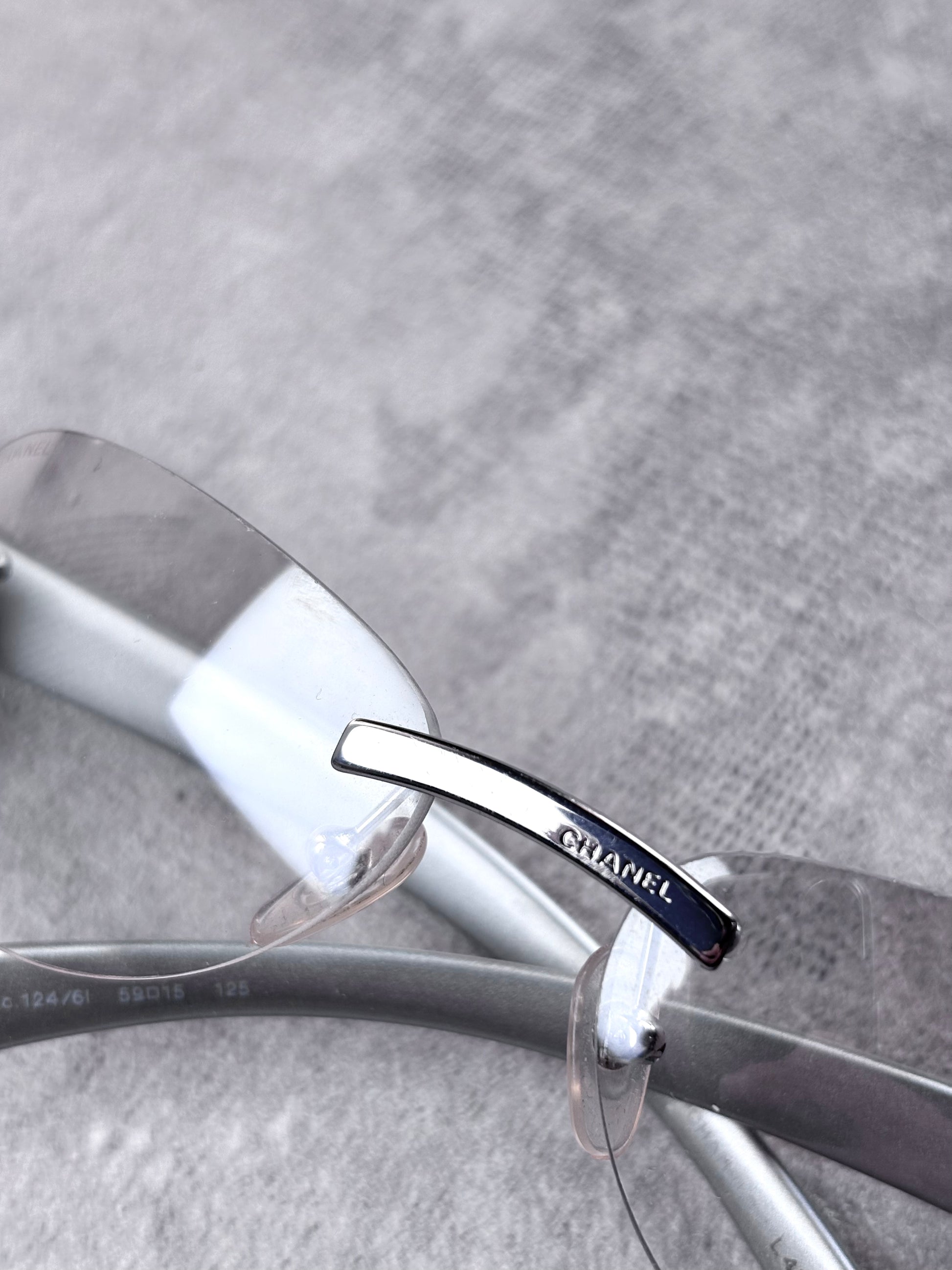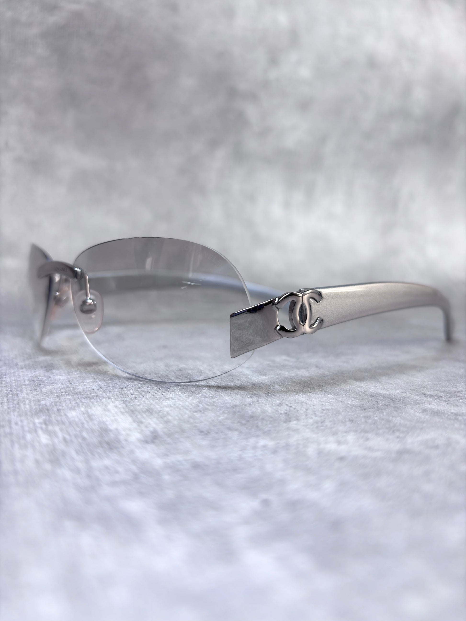 Vintage Chanel rimless sunglasses with clear lenses. Silver interlocking CC logo to each arm. Chanel engraved on the nose bridge. Original sunglasses case included.