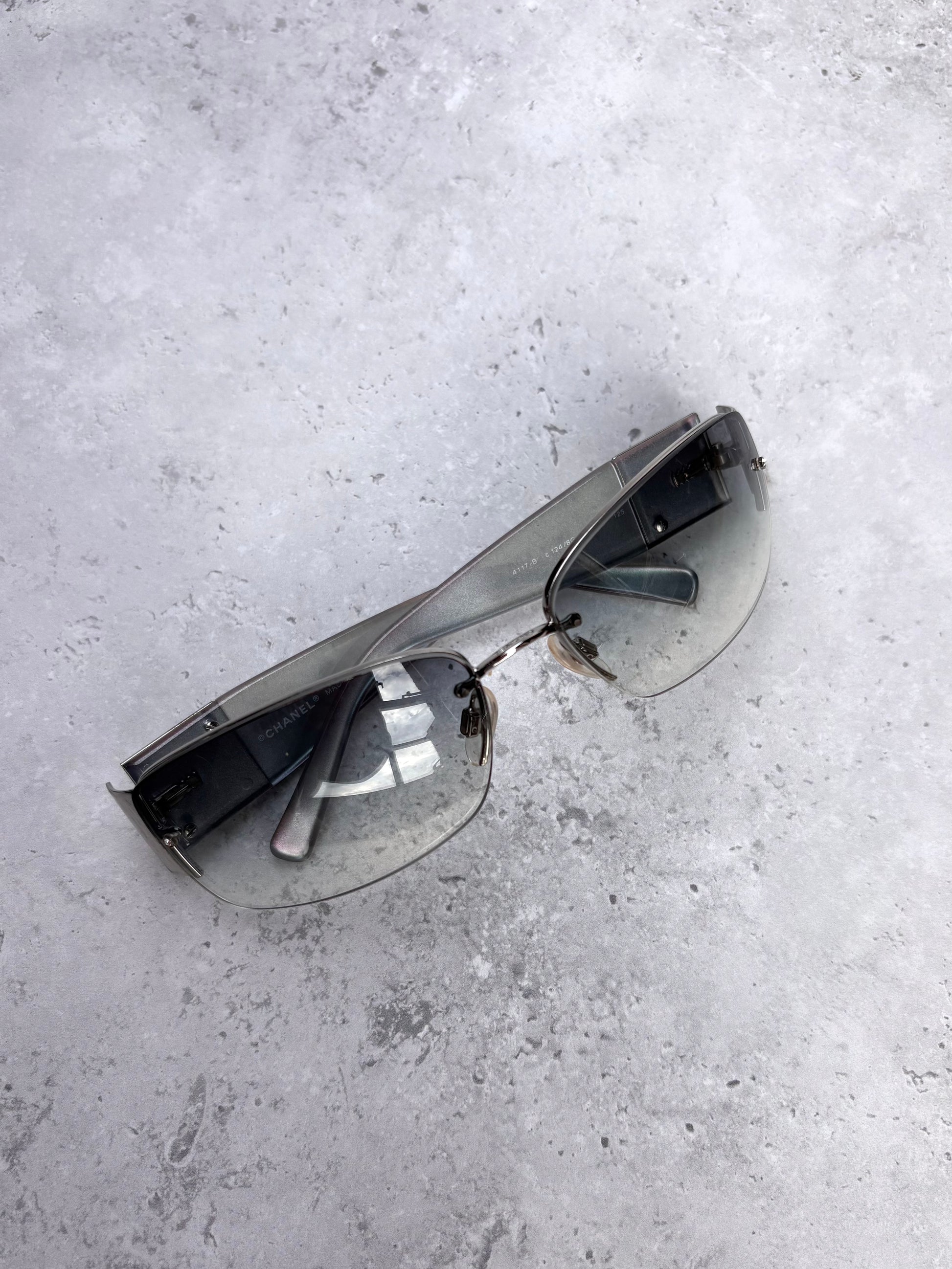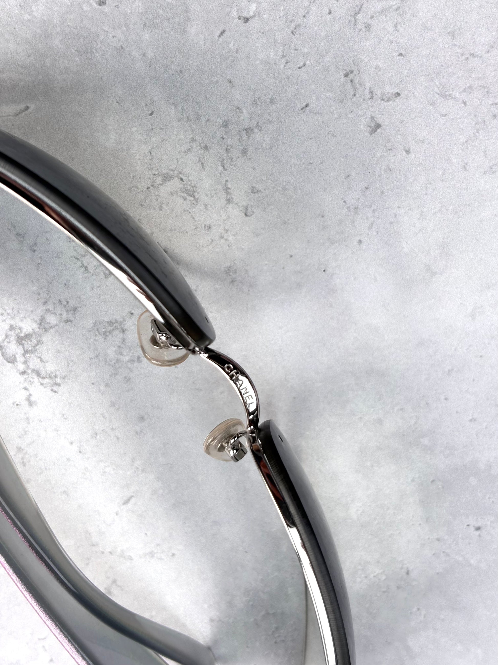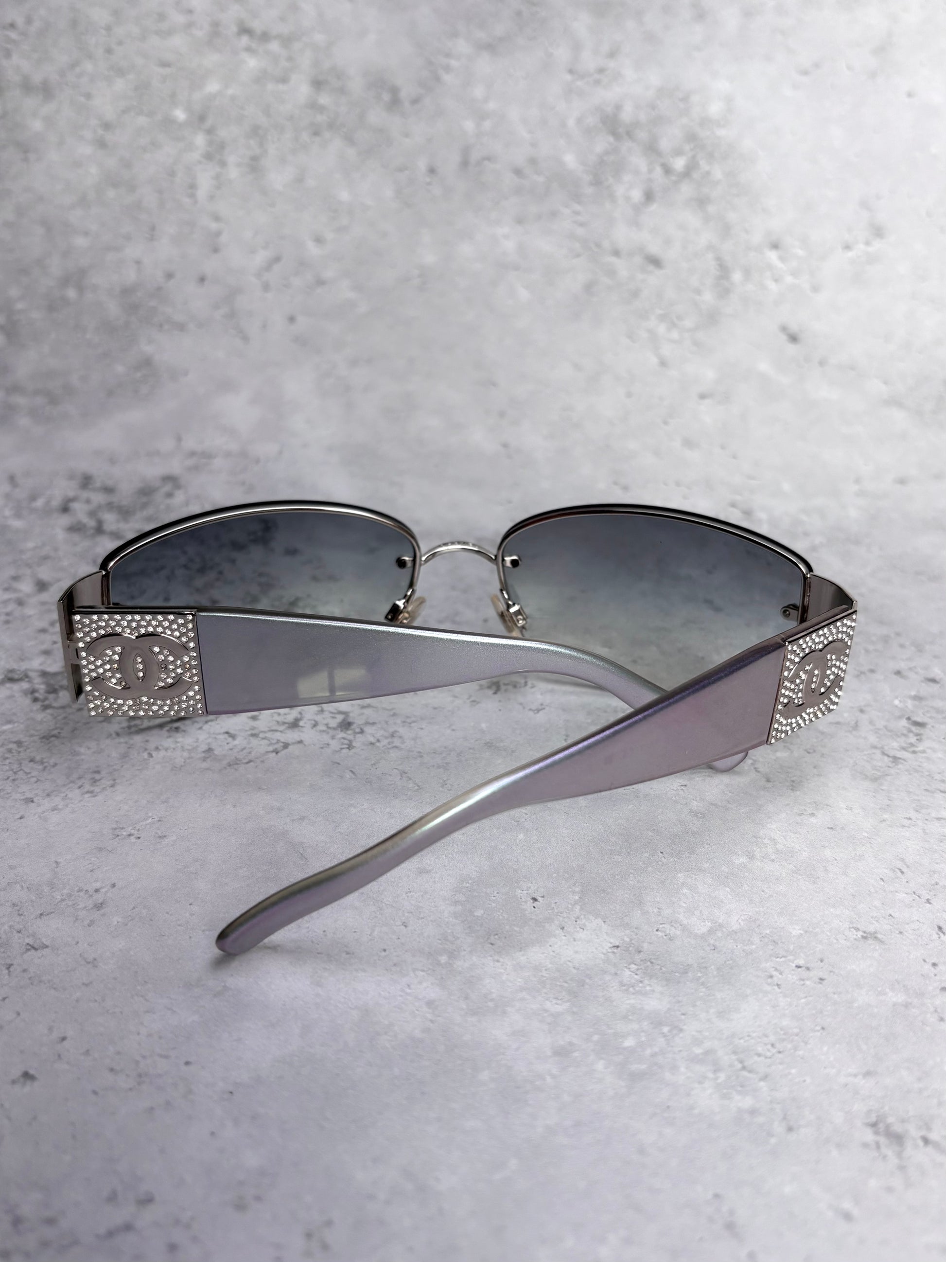 Vintage Chanel rimless sunglasses with iridescent blue/purple arms which change colour in the light. Ombre effect lenses. Swarovski crystal CC logo to each arm. Original sunglasses case included.