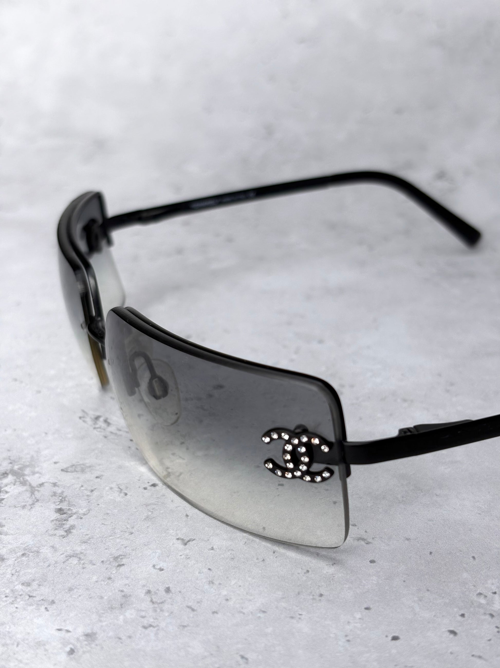 Vintage Chanel sunglasses with grey-blue ombre gradient lenses. Diamante CC logo to each side at the front. Original sunglasses case included (damaged).