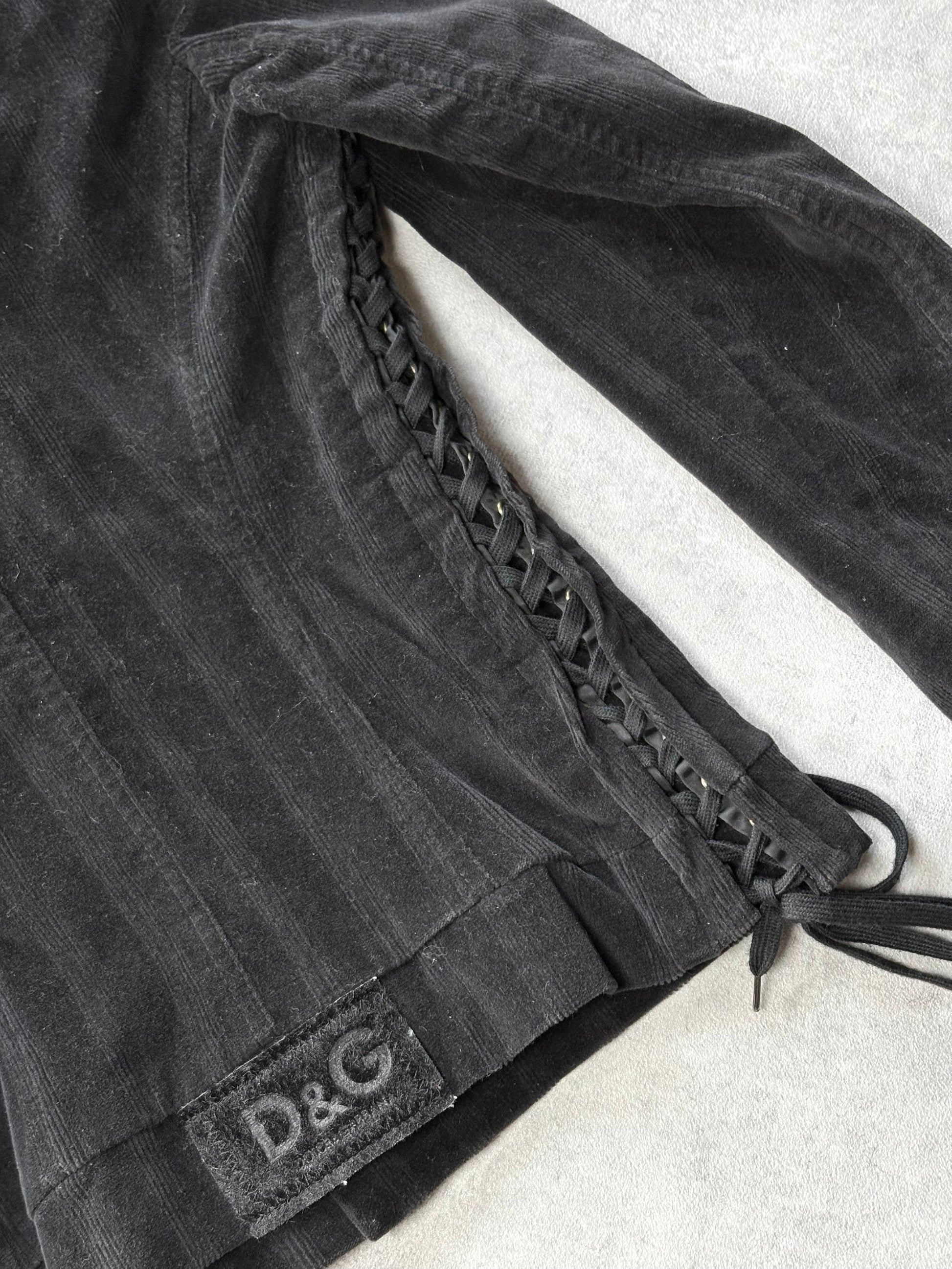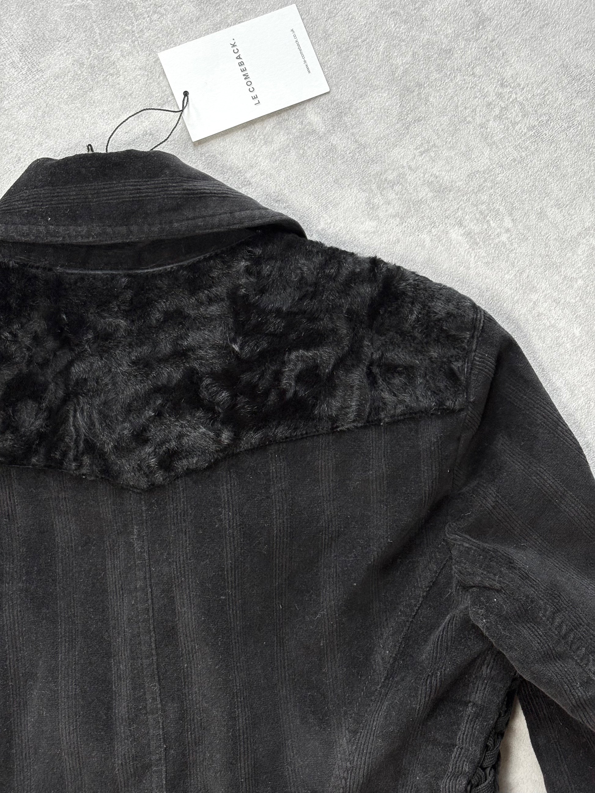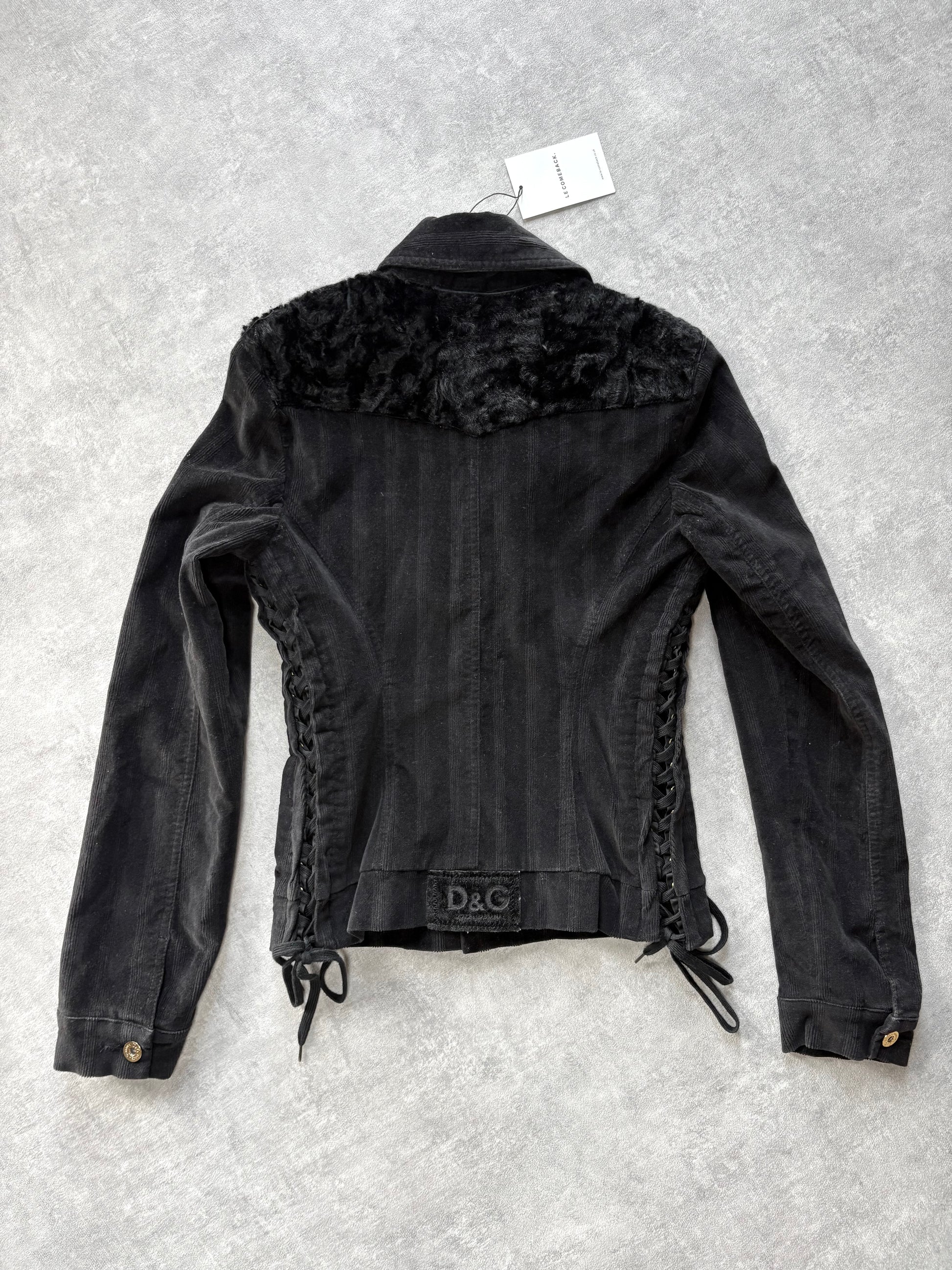 Vintage Dolce and Gabbana velvet effect jacket with fur panel and lace up corset back. Gold logo engraved buttons. Floral lining.