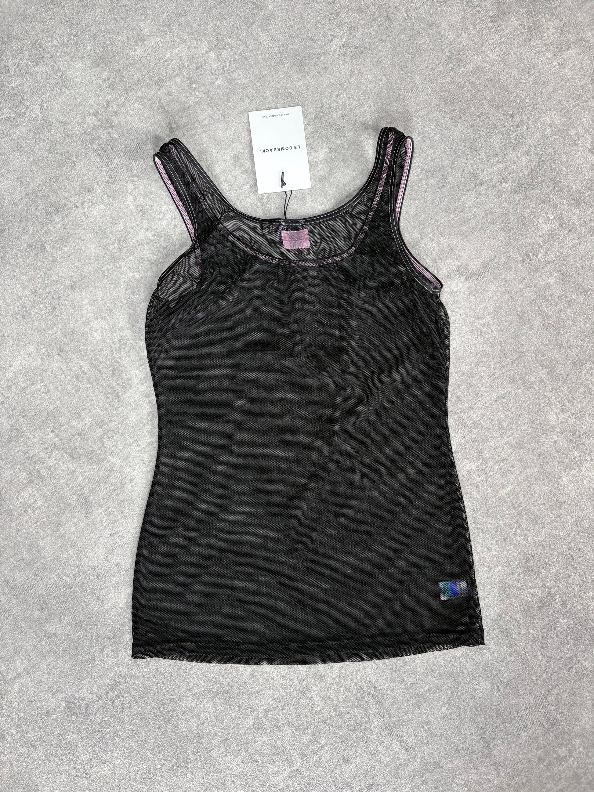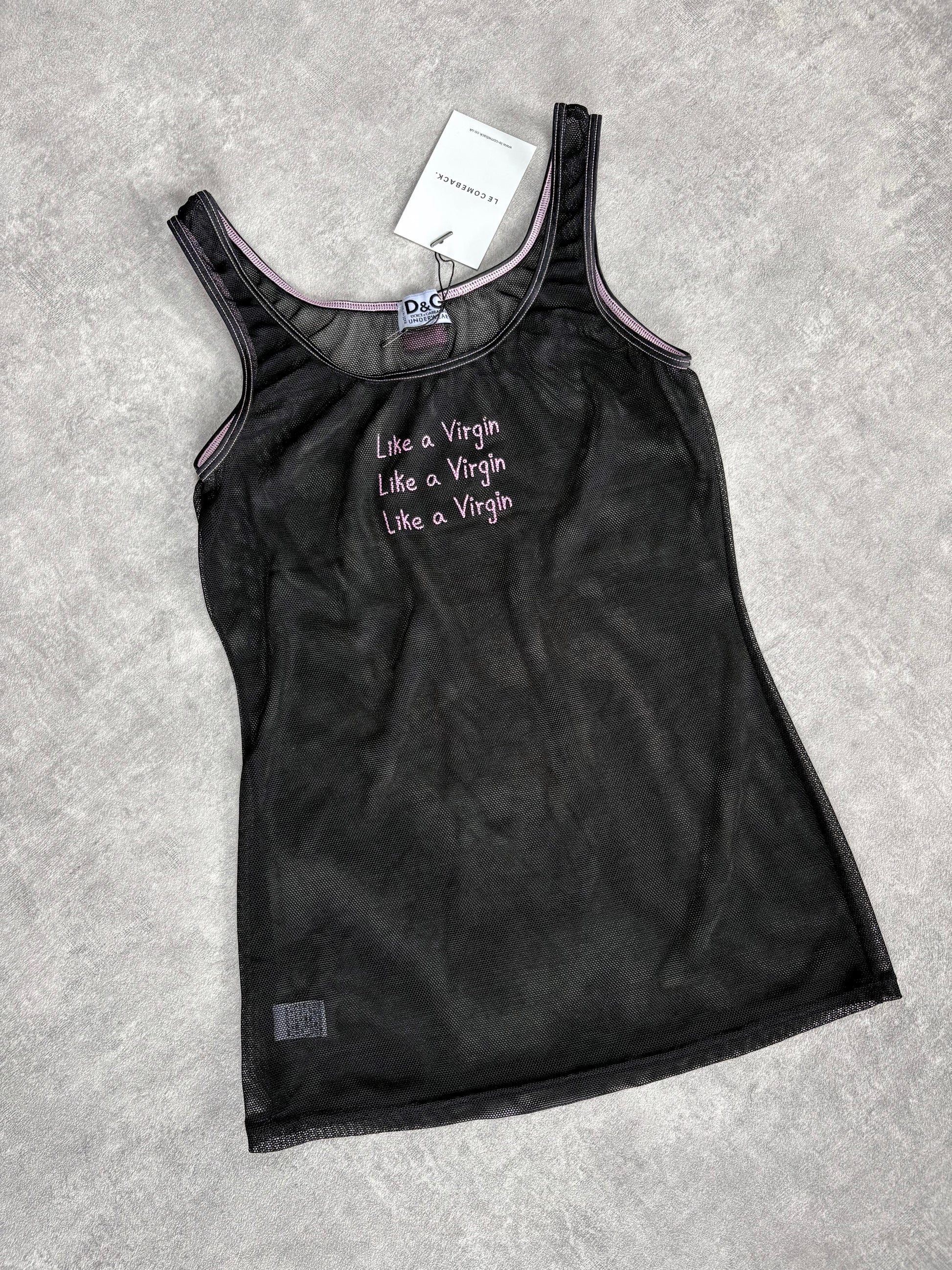 Rare vintage 2001 D&G tank top with 'Like a Virgin' pink embroidery. Scoop neck and contrast trims. Stretch mesh fabric.