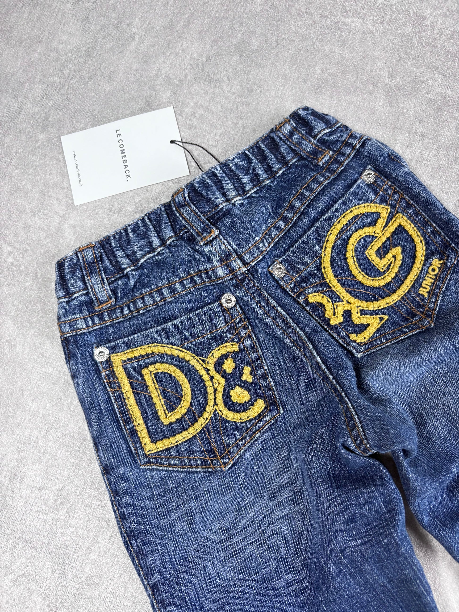Vintage D&G Junior denim jeans with large contrast logo to the back. Silver tone engraved popper buttons. Elasticated waistband. Matching jacket available here.