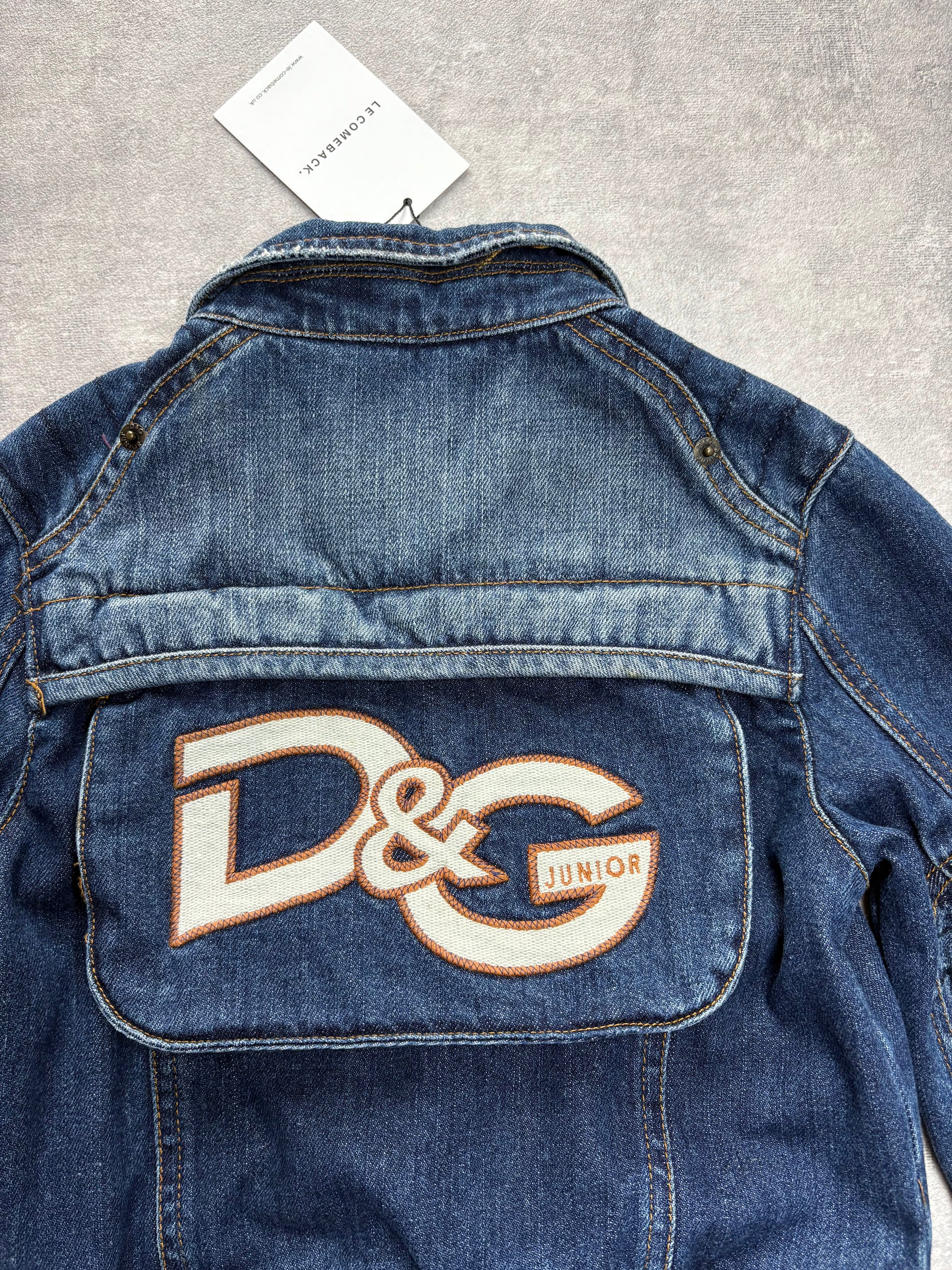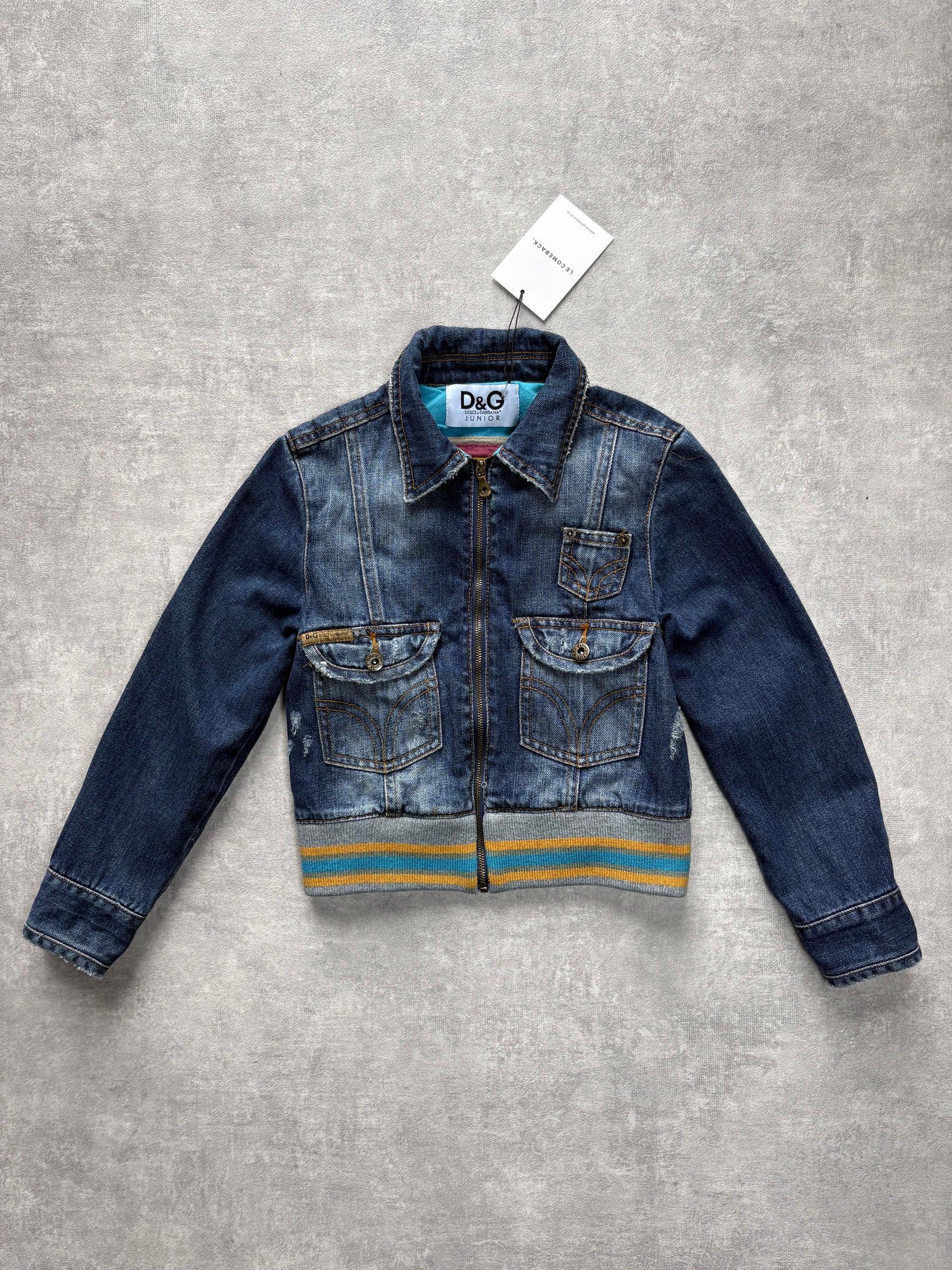 D&G Junior distressed denim jacket with full length front zip. Back logo pocket detail. Matching jeans available here.