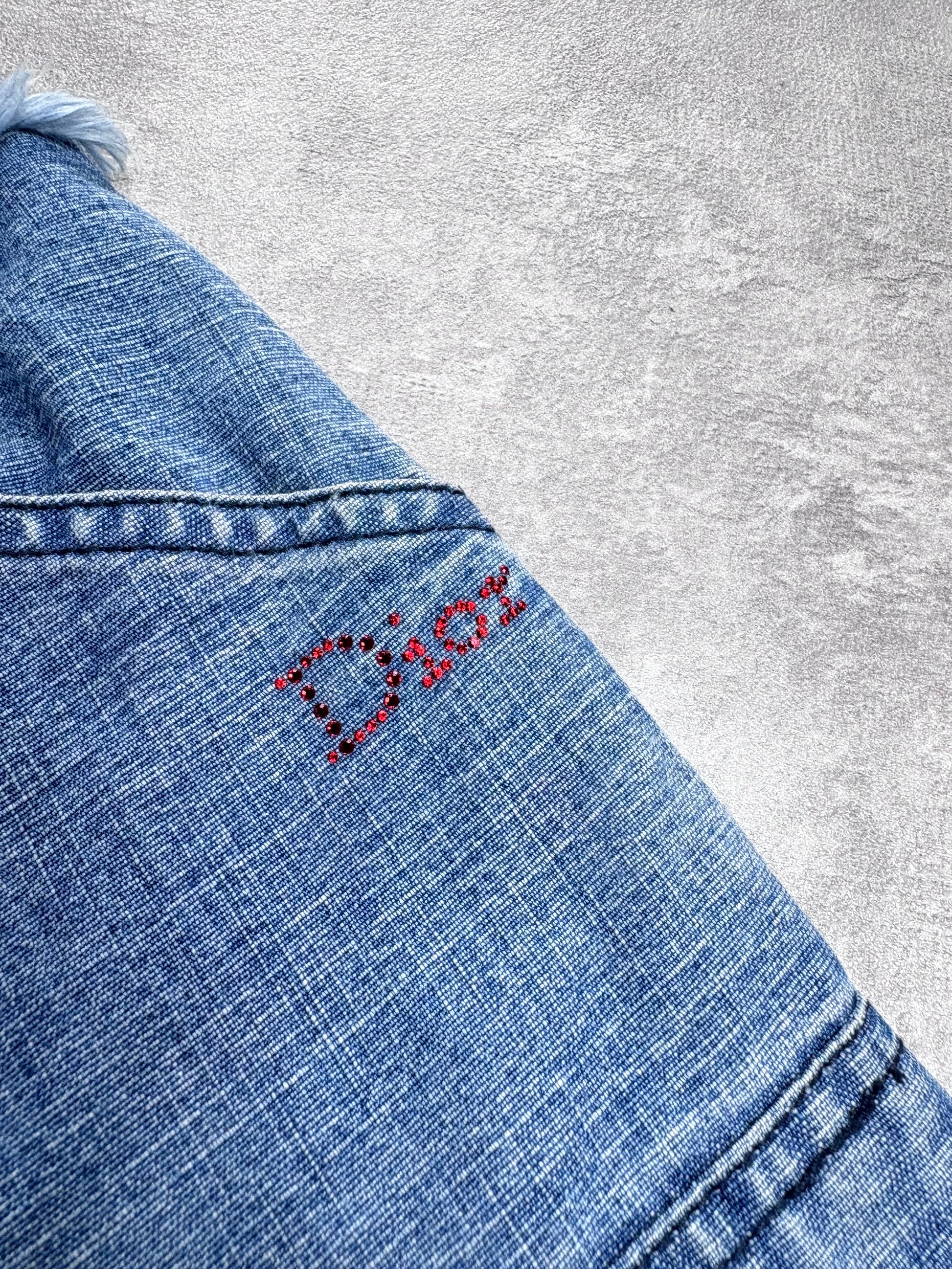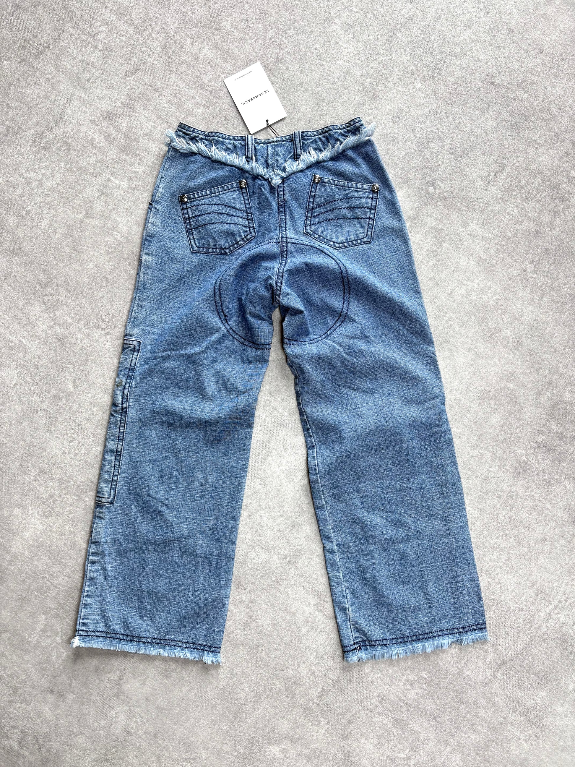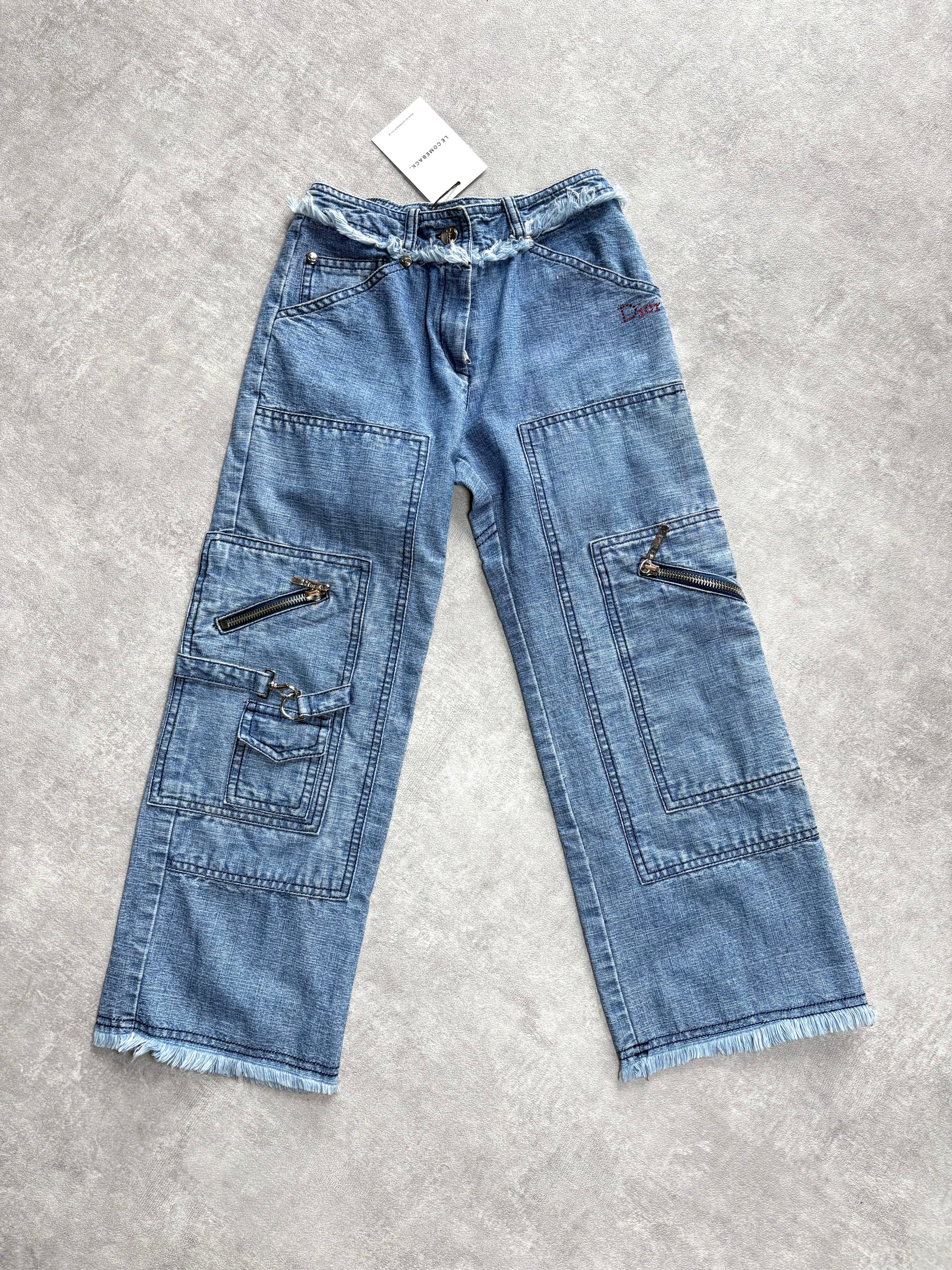 Vintage Dior utility style jeans with silver engraved buttons, zip pulls and clasps. Frayed waistband and hems. Crystal logo to the front. Early 2000's John Galliano era.