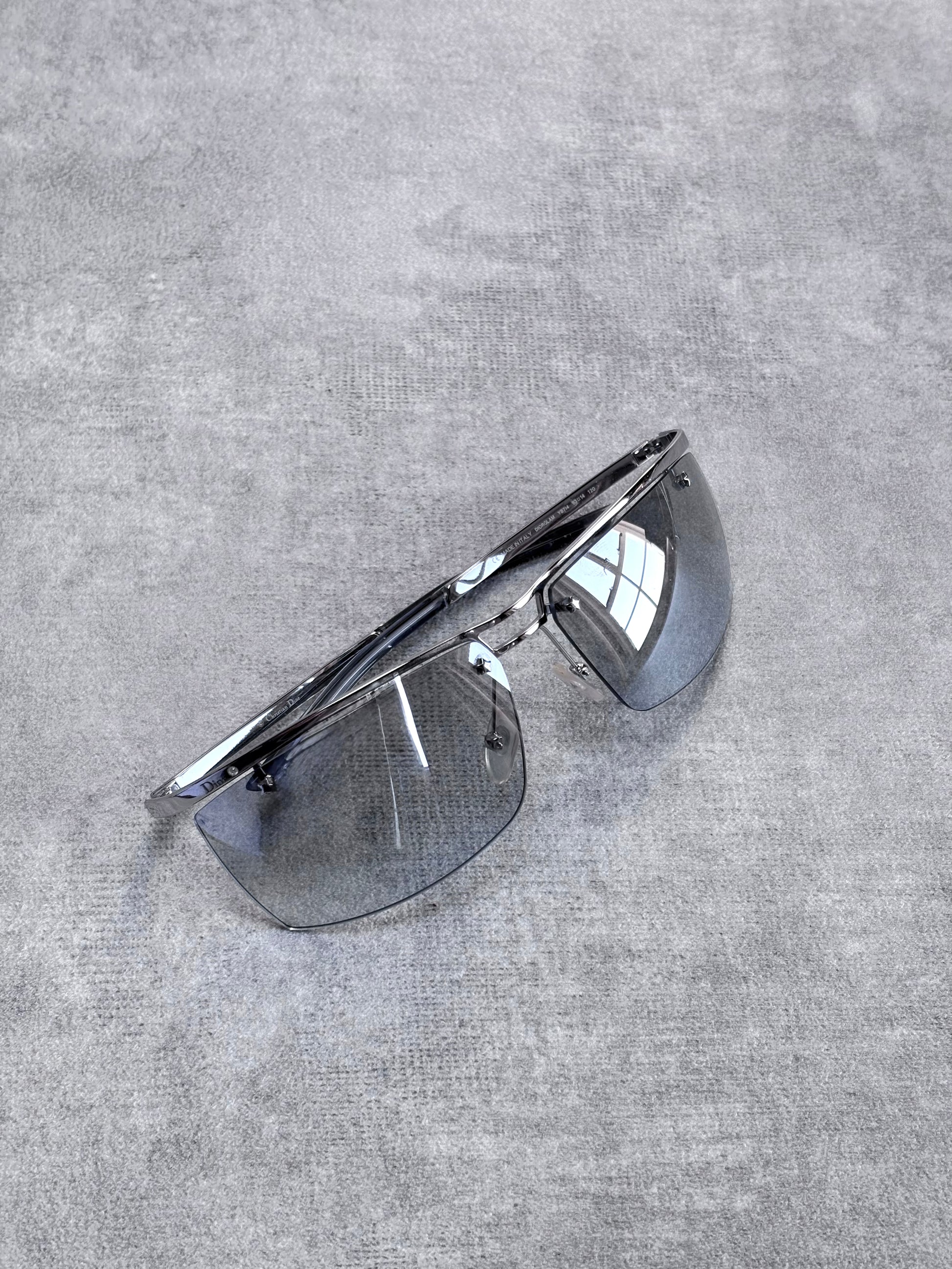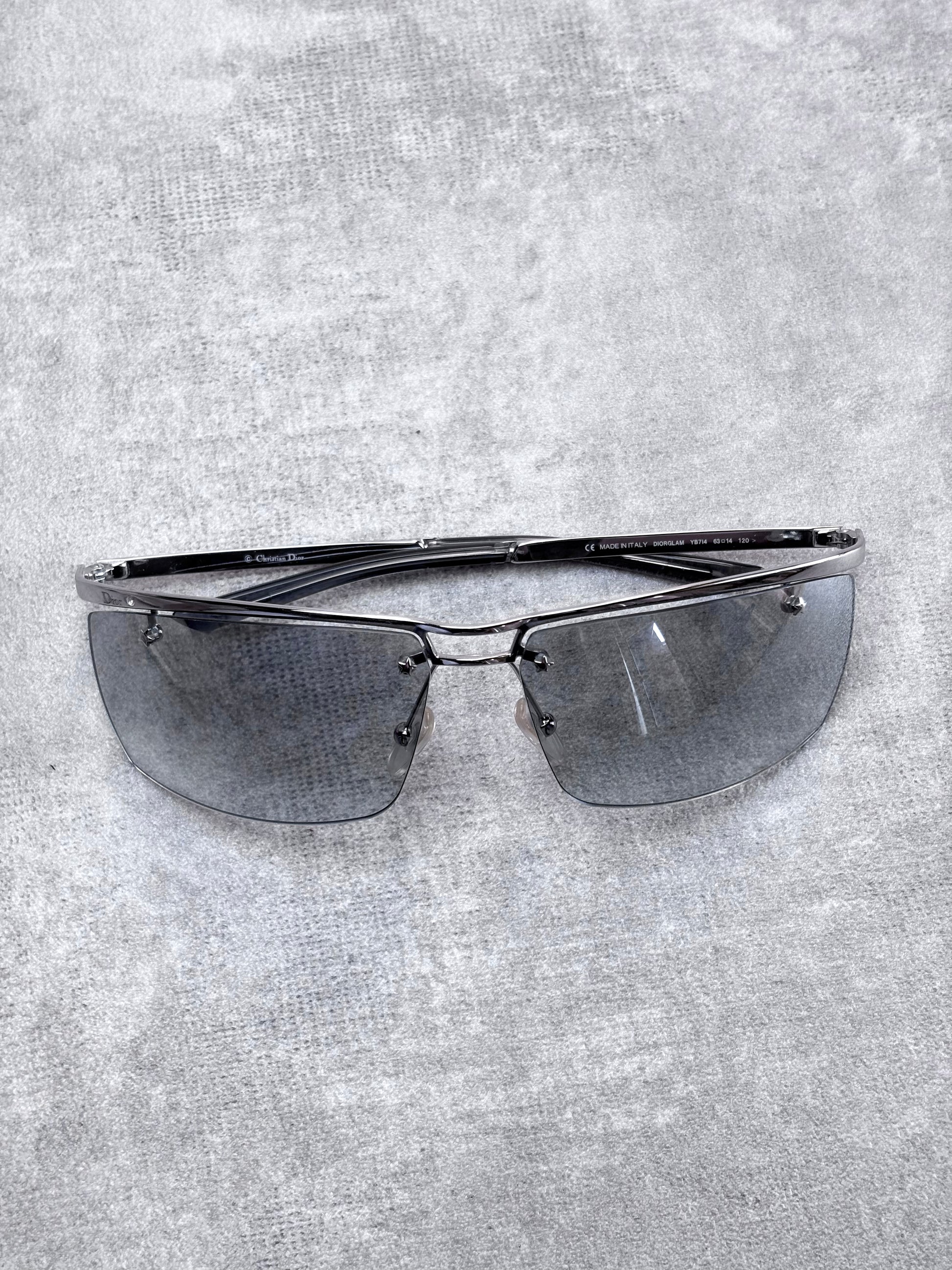 Vintage Dior 'Diorglam' rimless sunglasses featuring silver arms with stamped logo and star detailing. Blue/grey gradient lense. Original sunglasses case included.