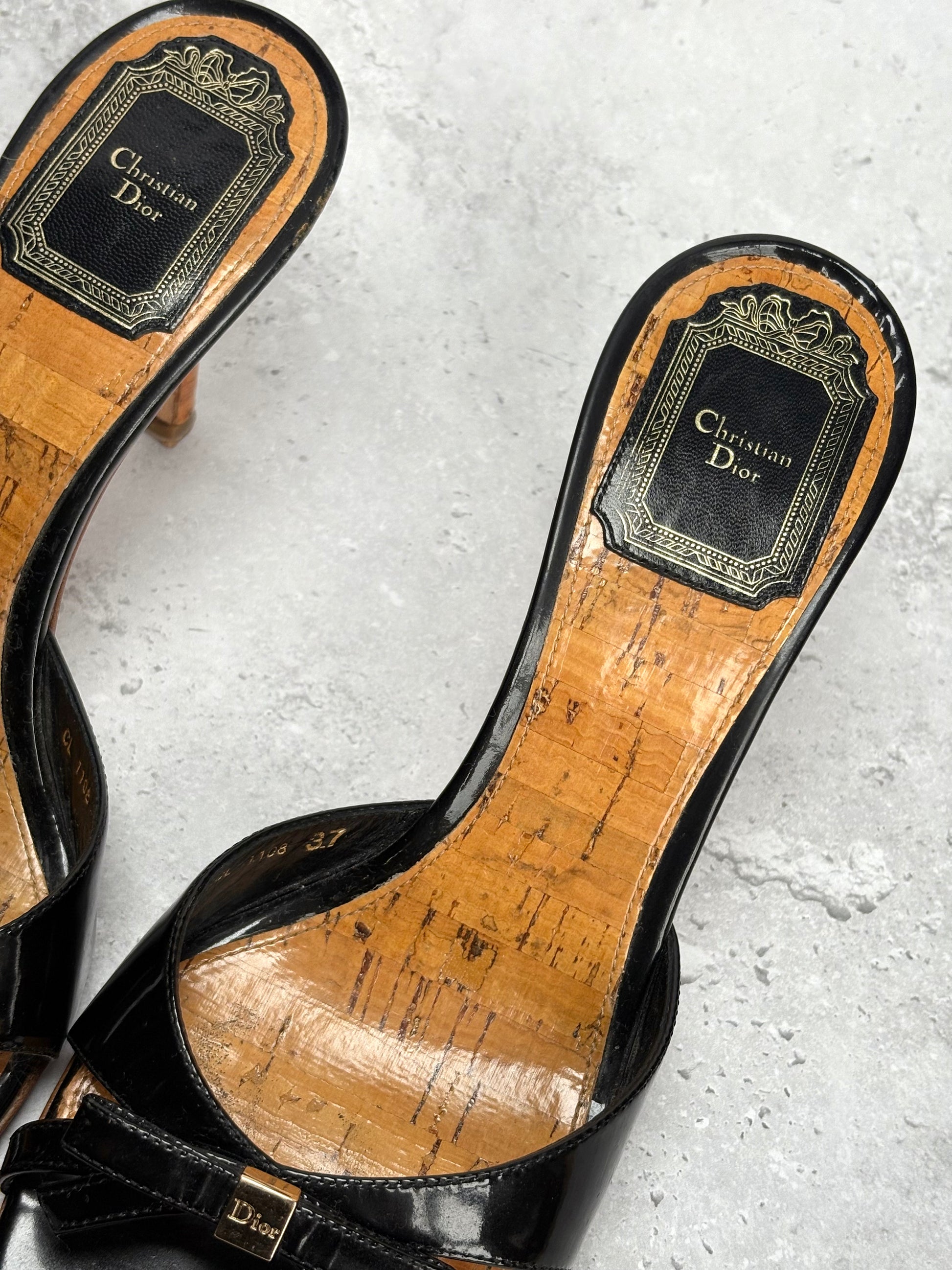 Dior black patent leather mule heel with silver engraved logo detail and bow. Cork style insole with 3 inch heel. Size 37 / UK4. Comes with original dustbag.