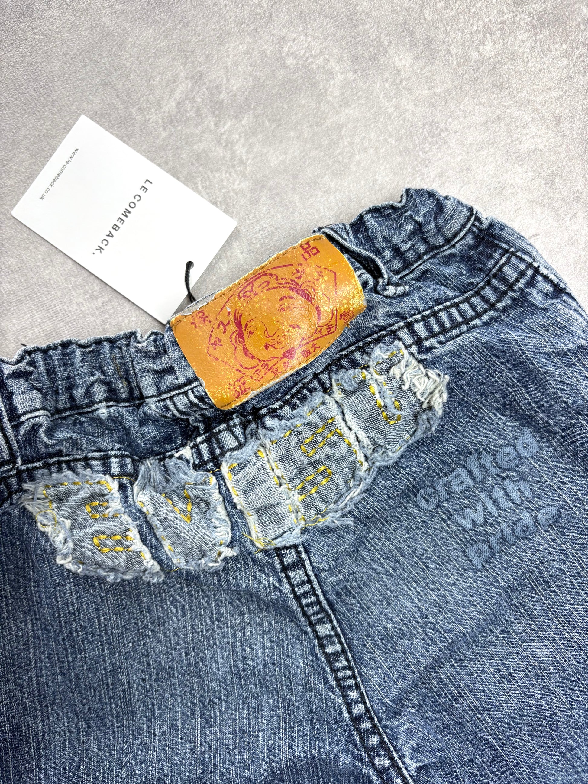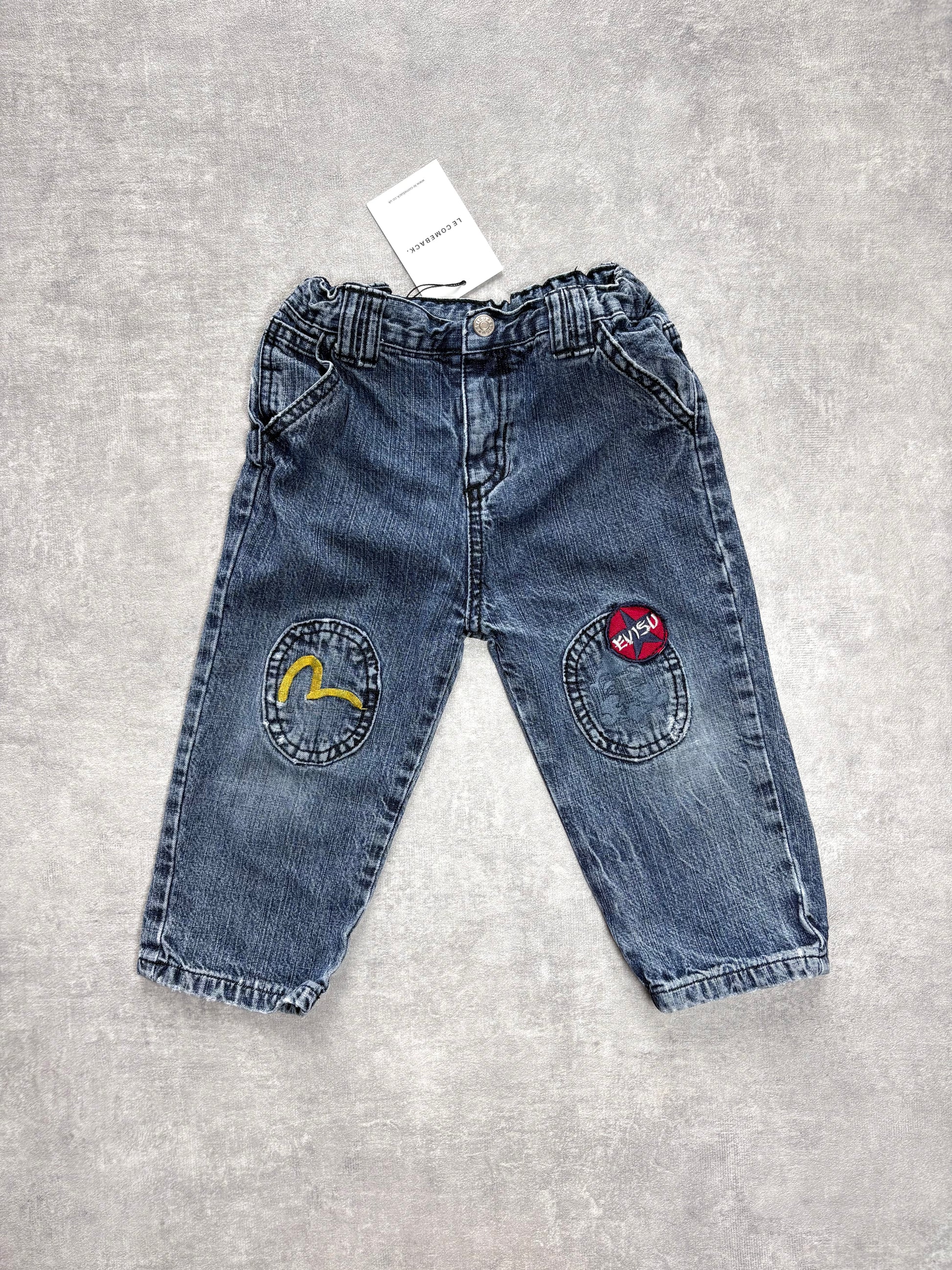 Vintage Evisu denim jeans with knee patches and distressed logo to the back. Engraved hardwear. Leather logo patch.