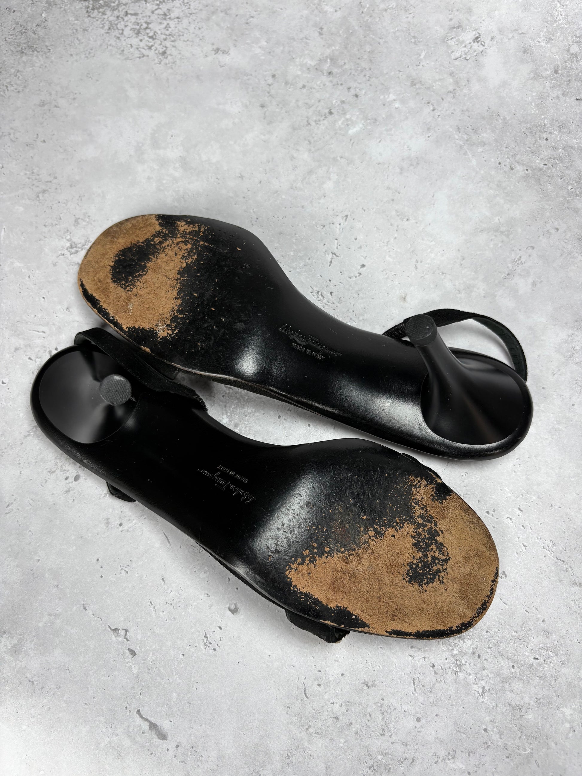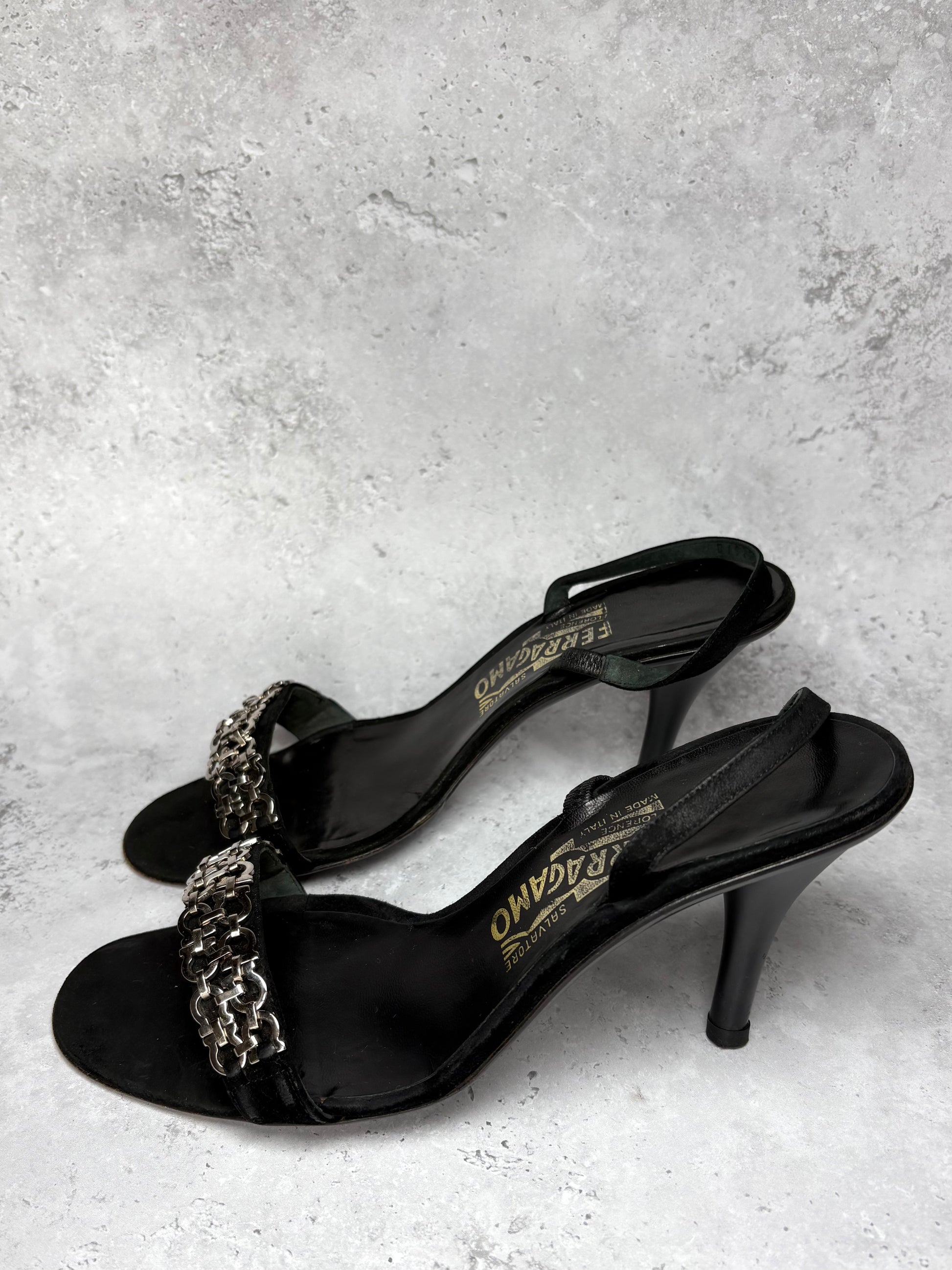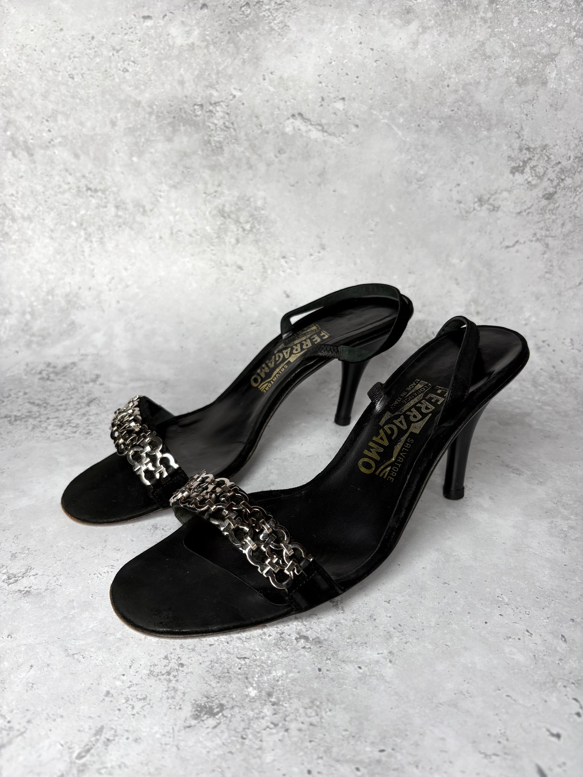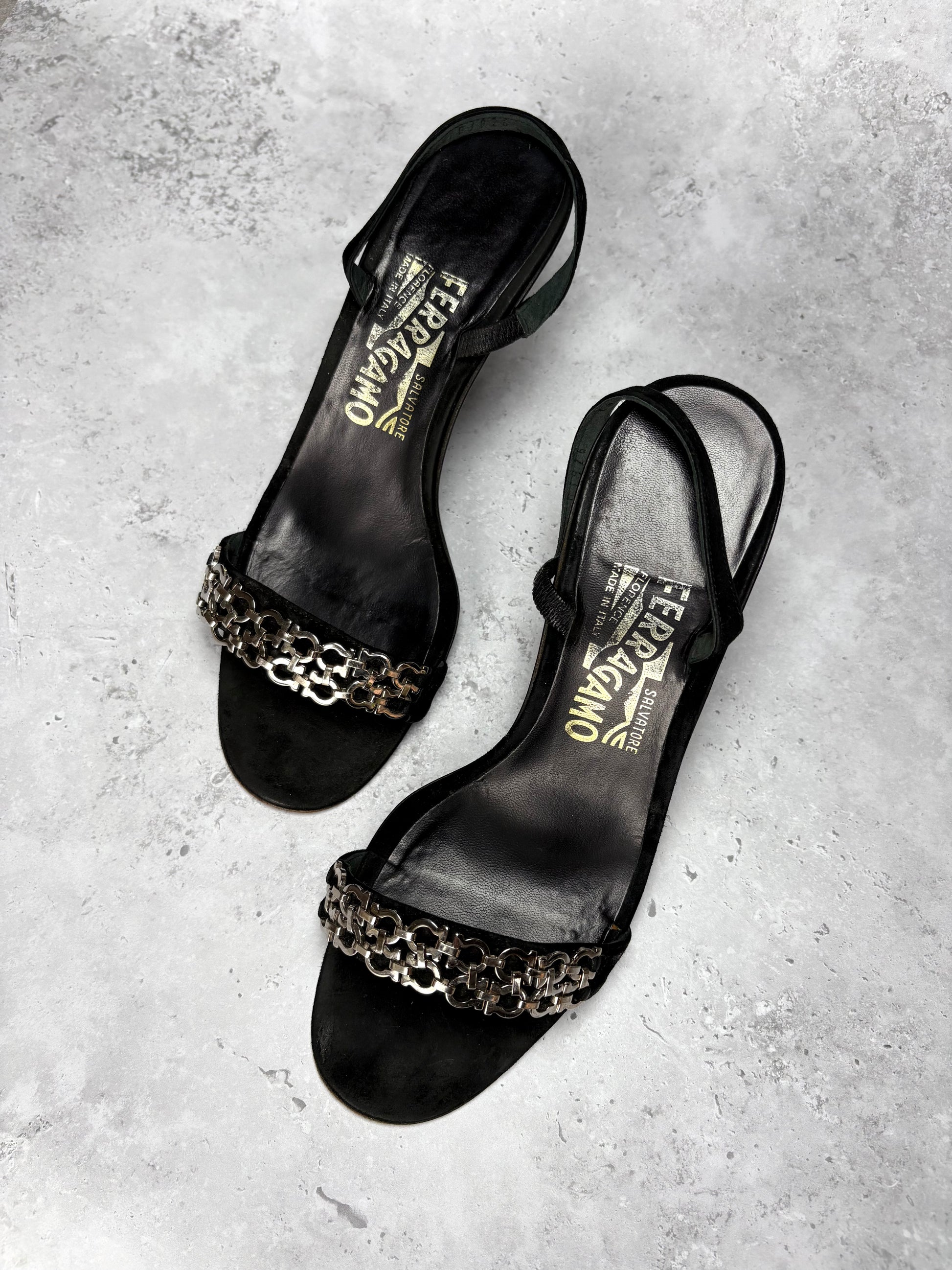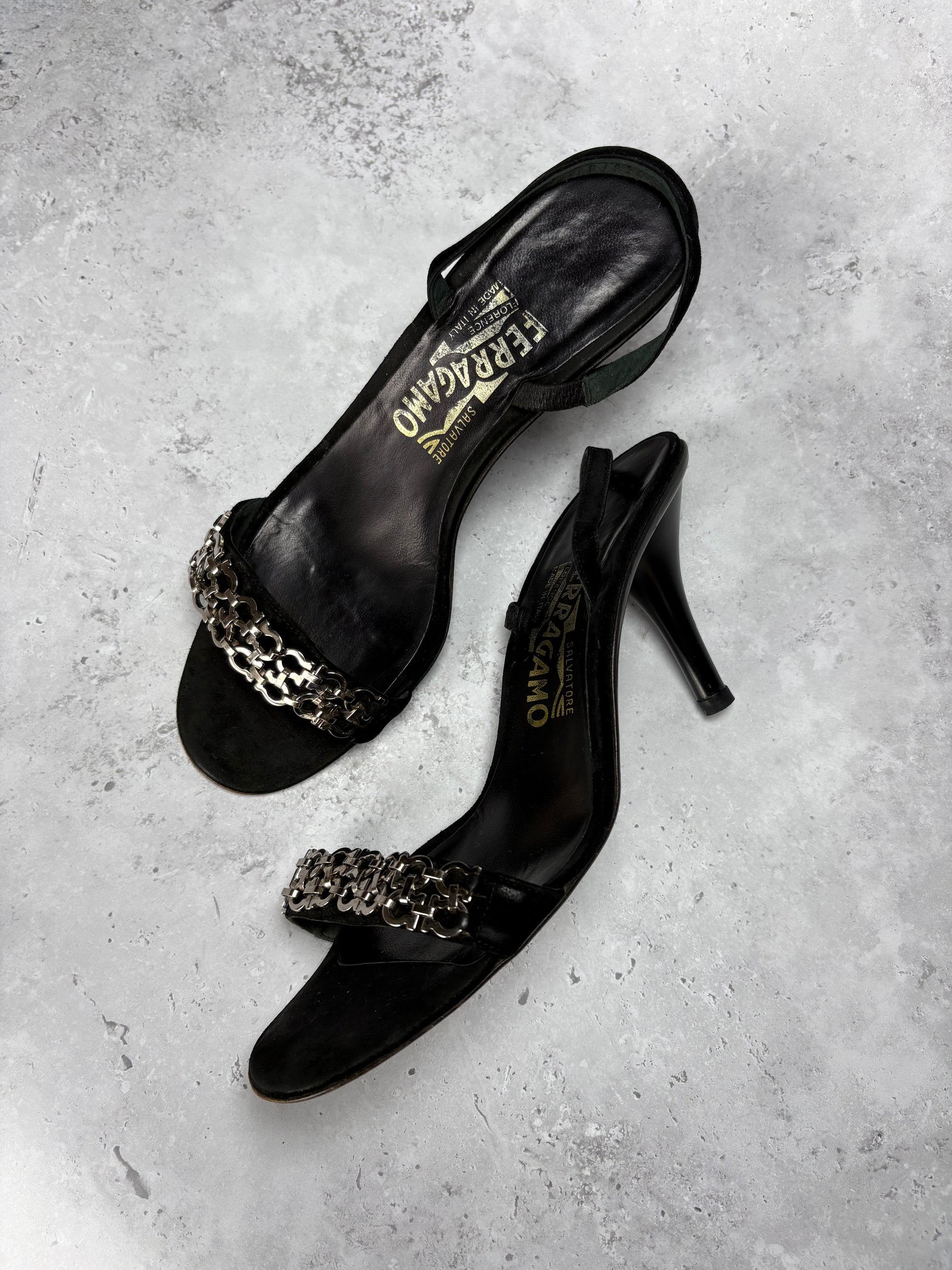 Salvatore Ferragamo black suede heels with silver logo chain strap. Size 39/ UK6. Comes with original dustbag and box.