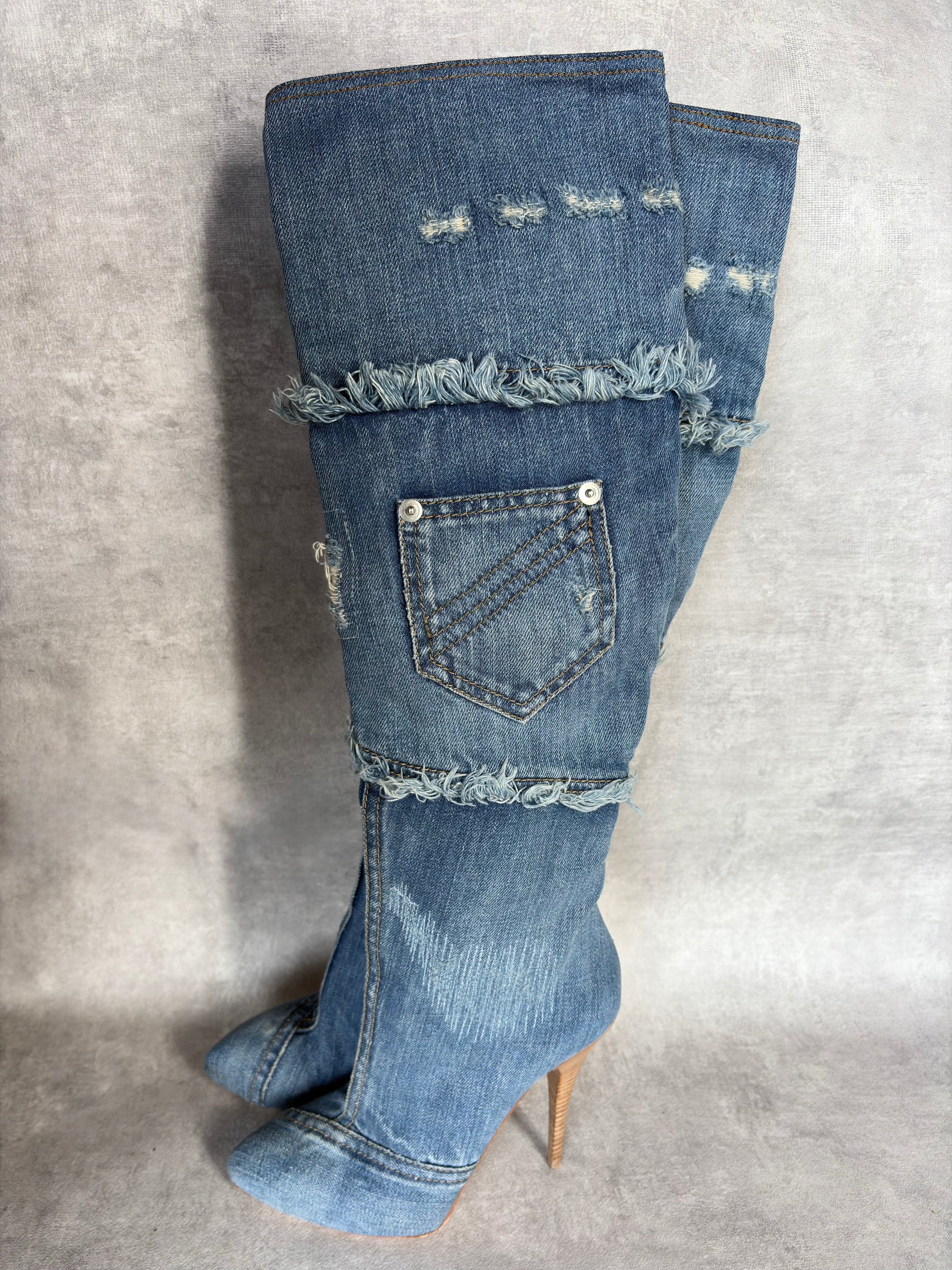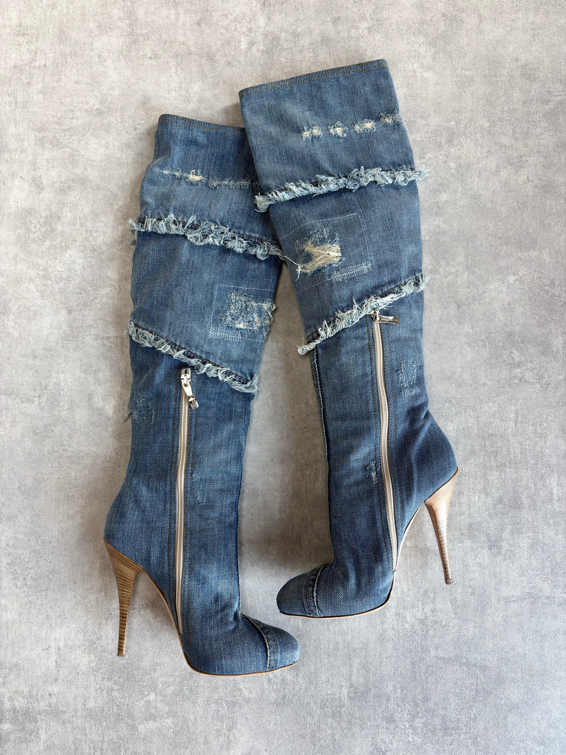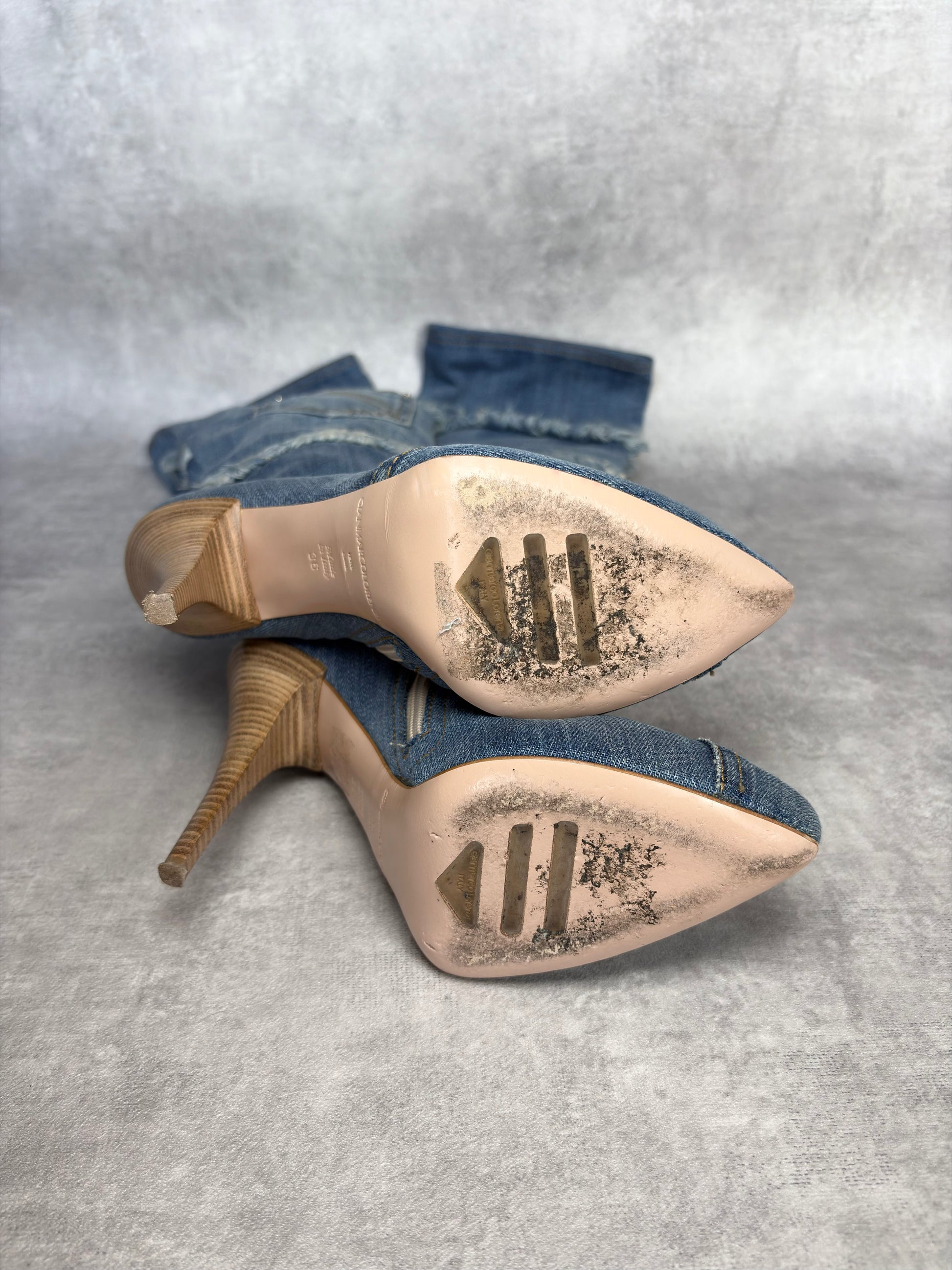 Vintage Gianmarco Lorenzi denim heel boots with distressed details. Logo branded zips. 5" heel and slight platform. Size 36/UK3. Do not come with box.
