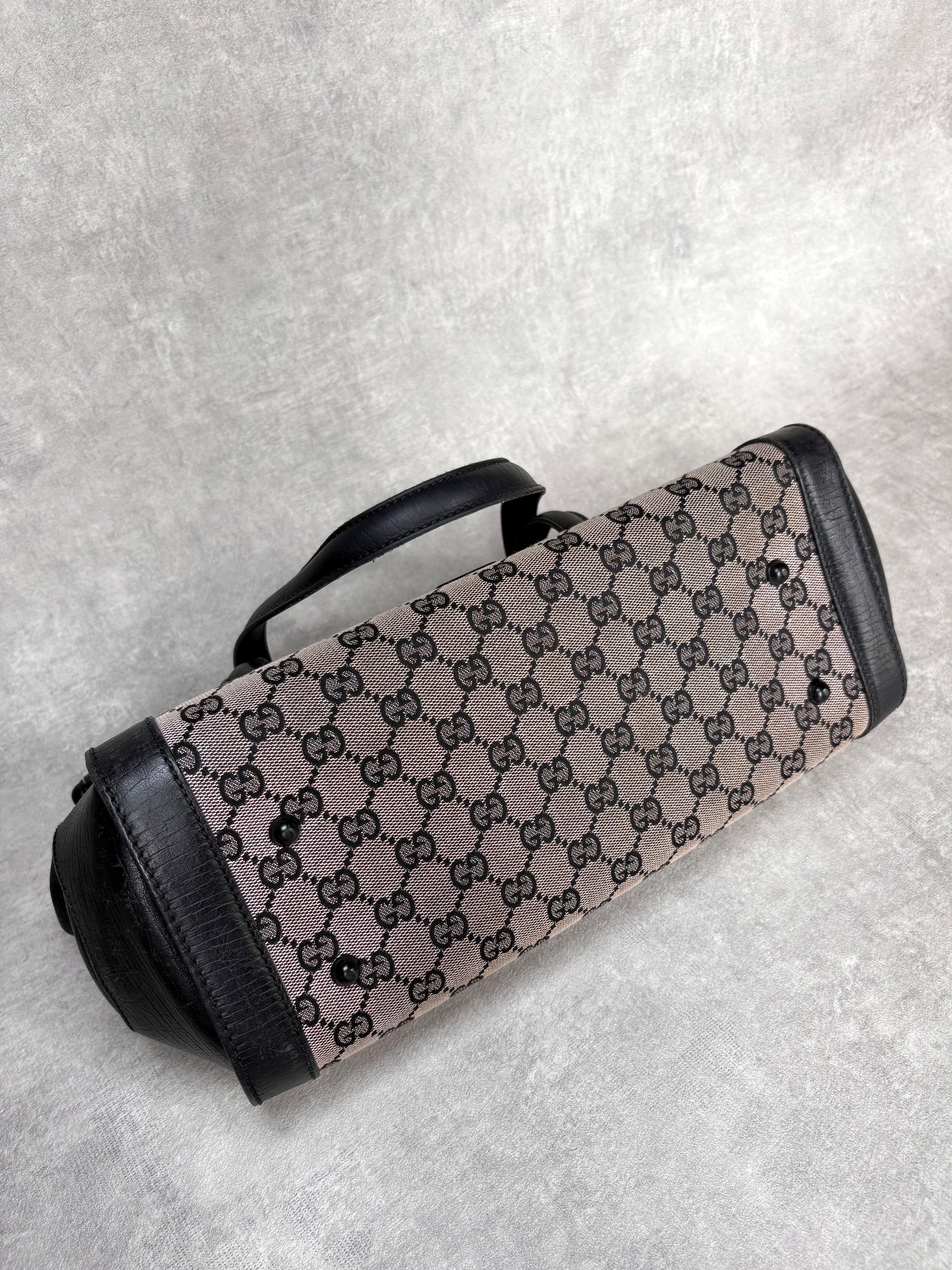 Gucci Bamboo Bullet bag from the Tom Ford era. Canvas fabric with interlocking monogram logo, bamboo detail, matte black hardware and matte black clasp with Gucci engraving. Textured leather. Interior has a zip pocket. Sent with original dustbag.