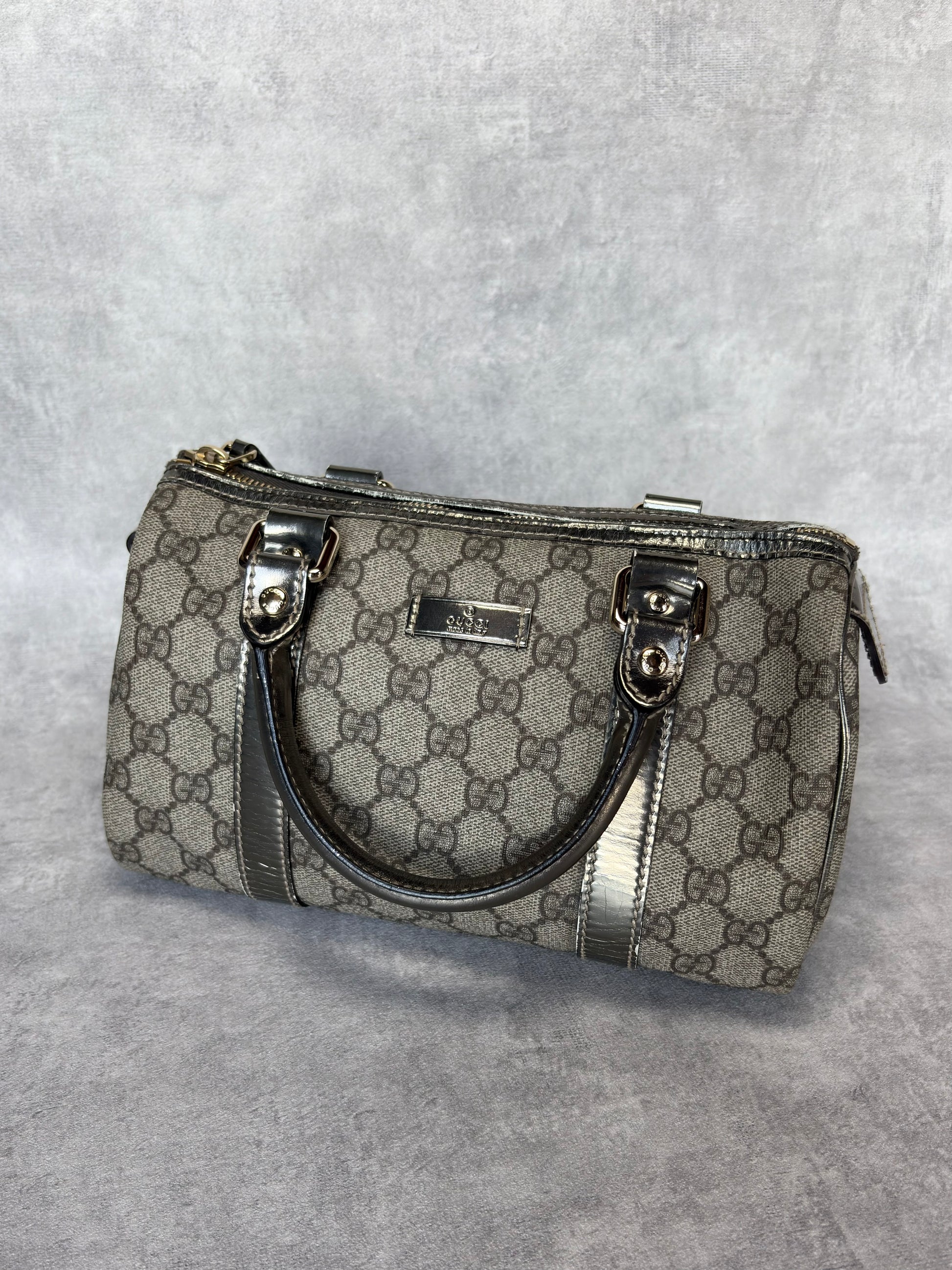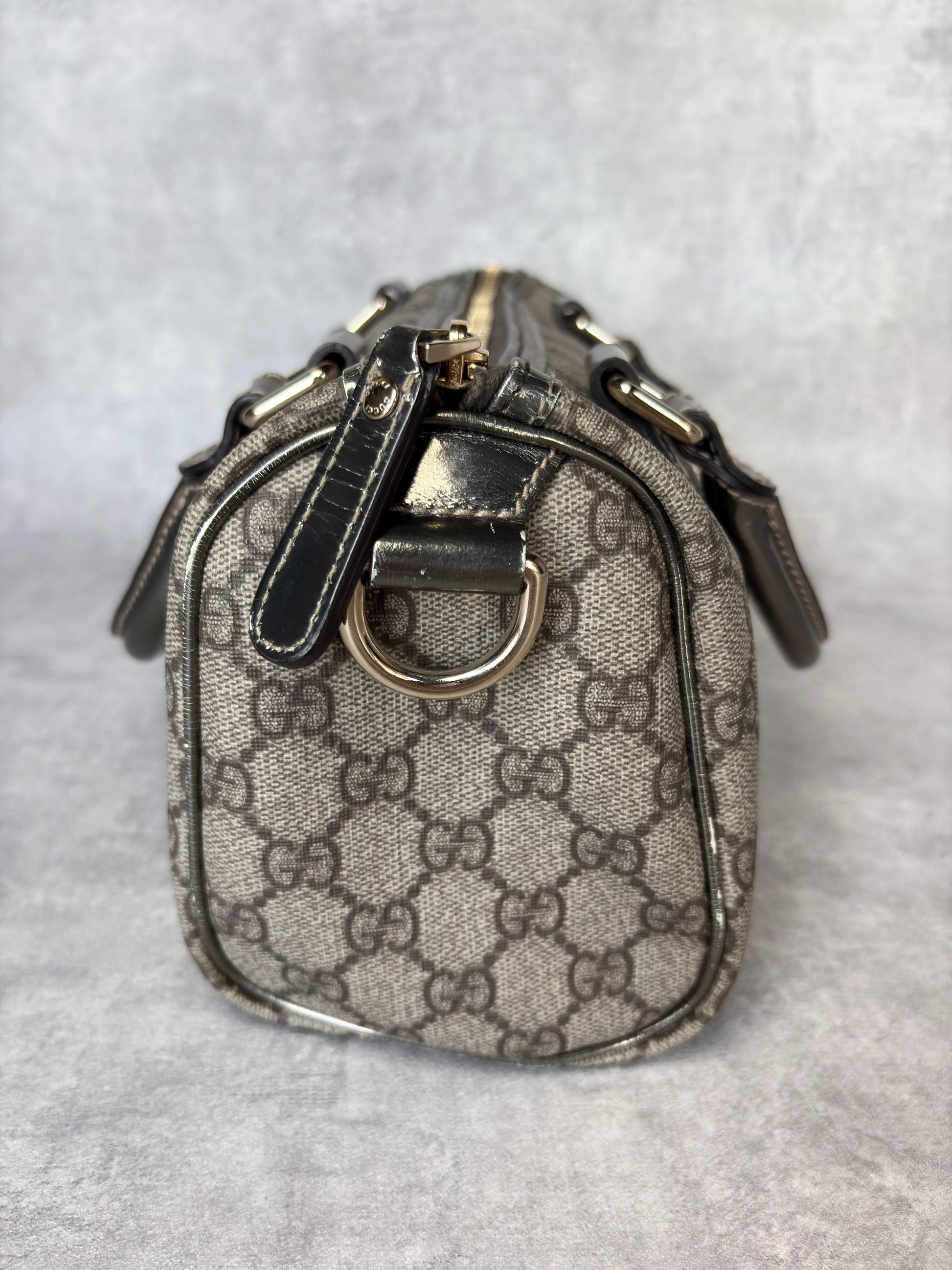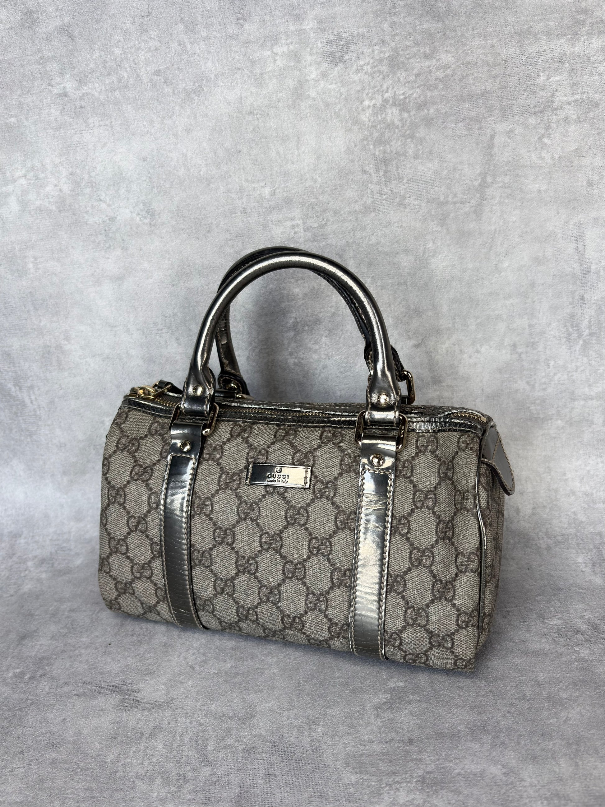 Vintage Gucci Boston bag with monogram logo print and metallic bronze/pewter trims. Gold branded hardware. Double rolled leather handles and zip closure with pull tab. Interior has a slot pocket and logo tab. Comes with original dustbag.