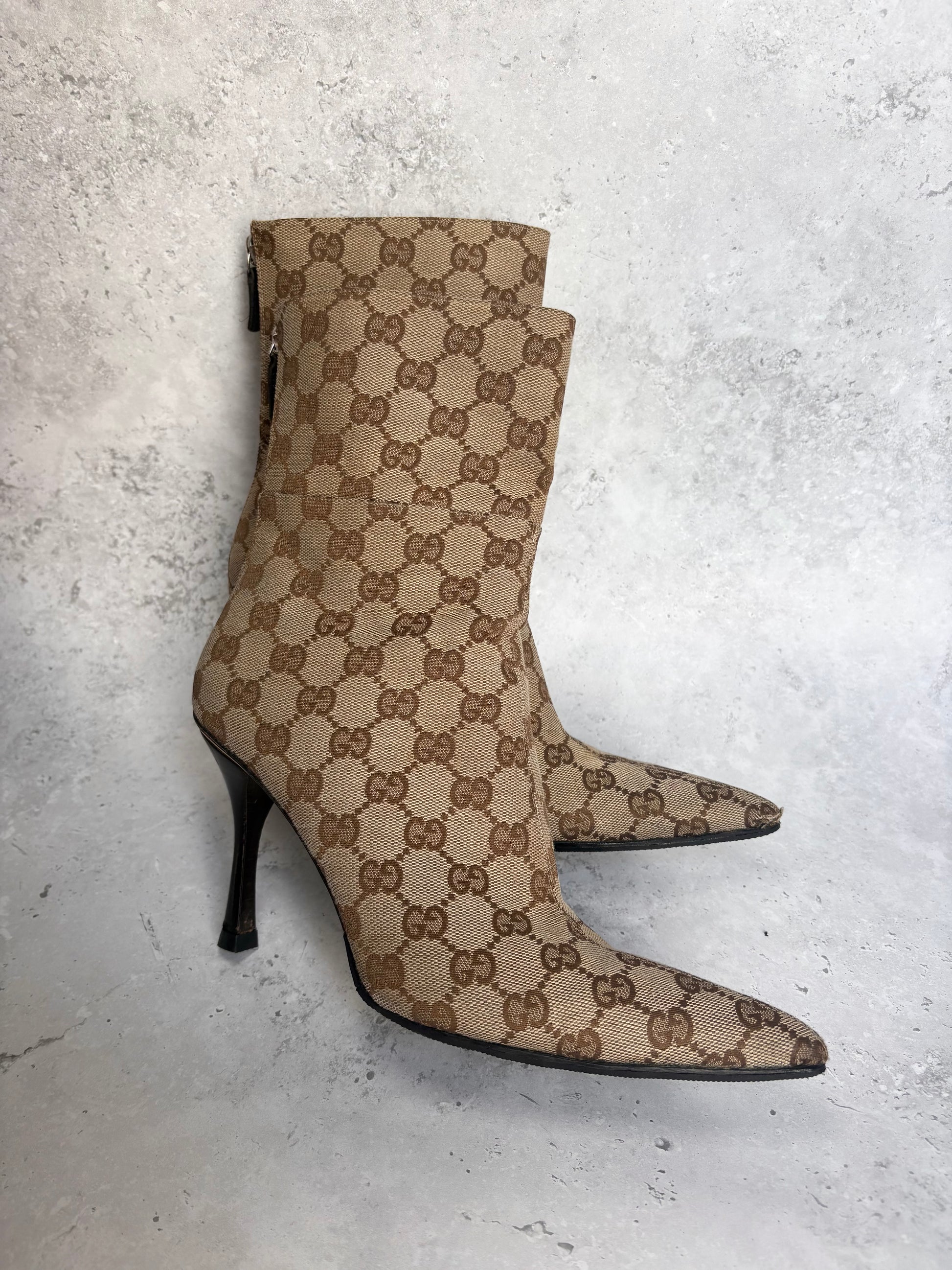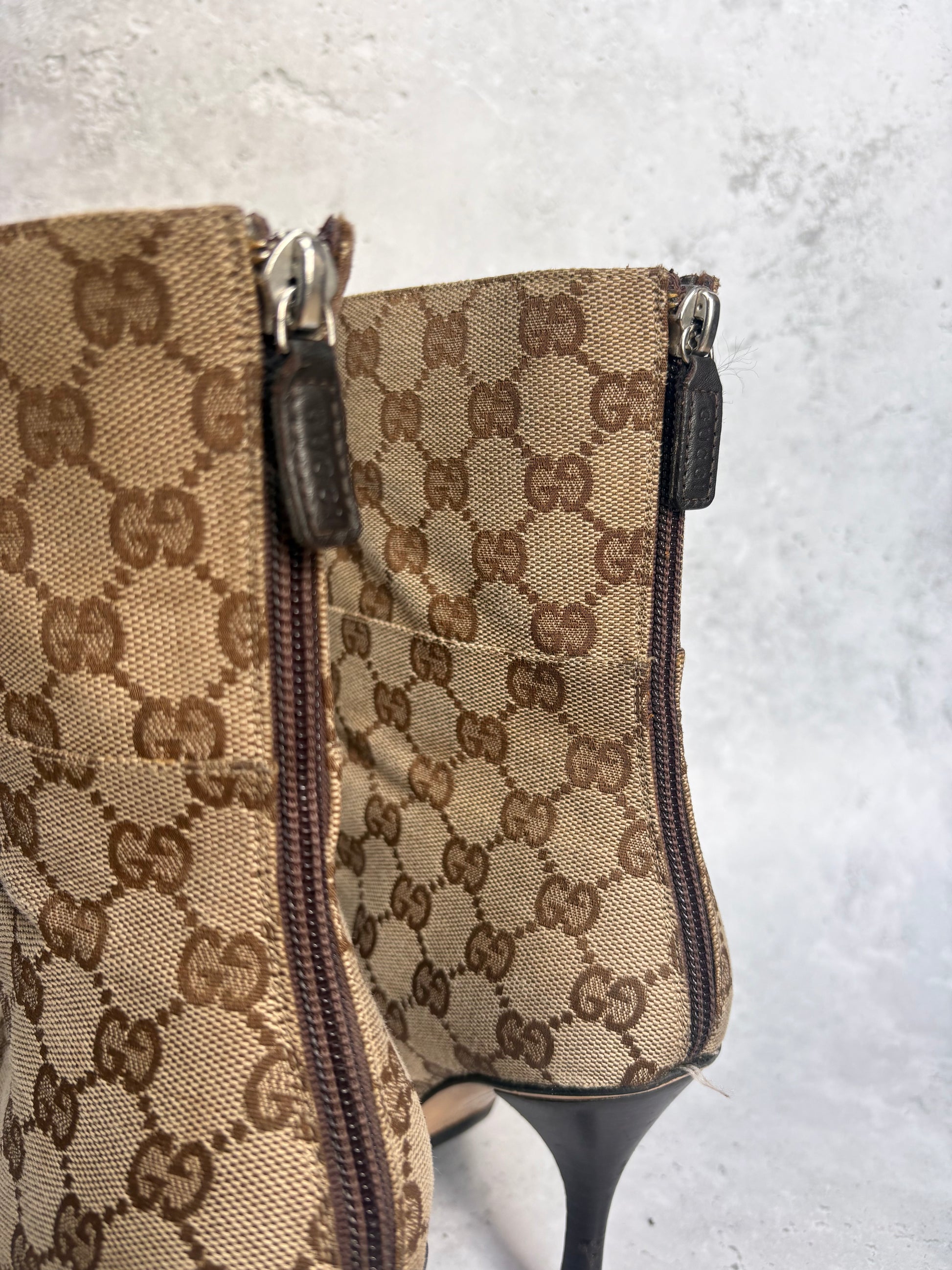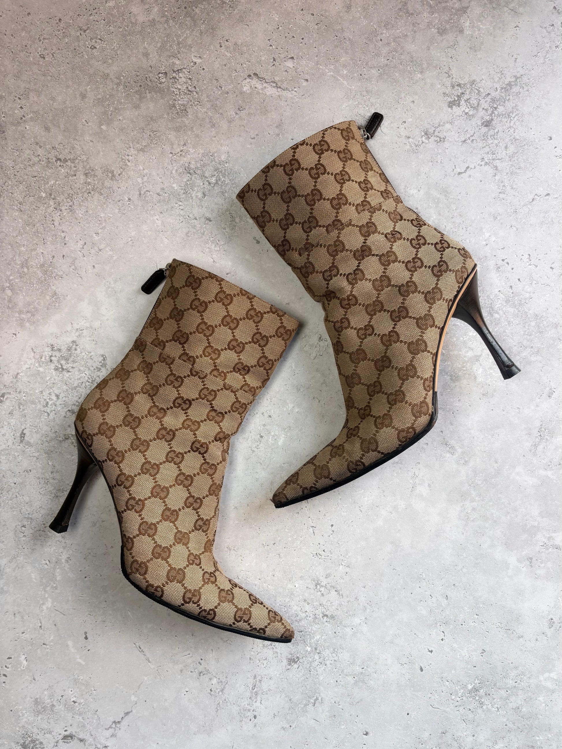 Vintage Gucci canvas ankle boots from the Tom Ford era with all over classic monogram logo. Back zip. Logo to interior and sole. Come with Le Comeback dustbag.