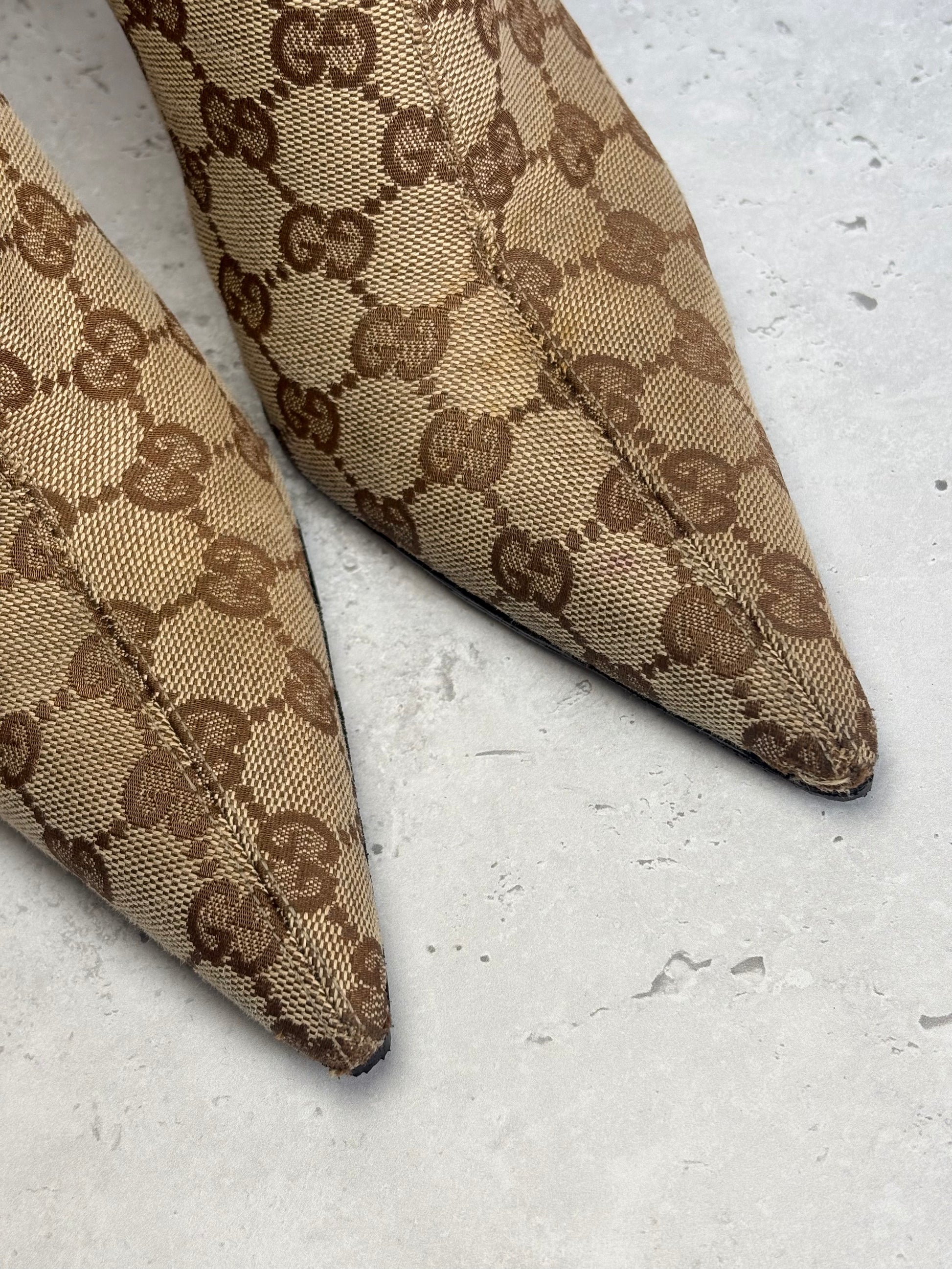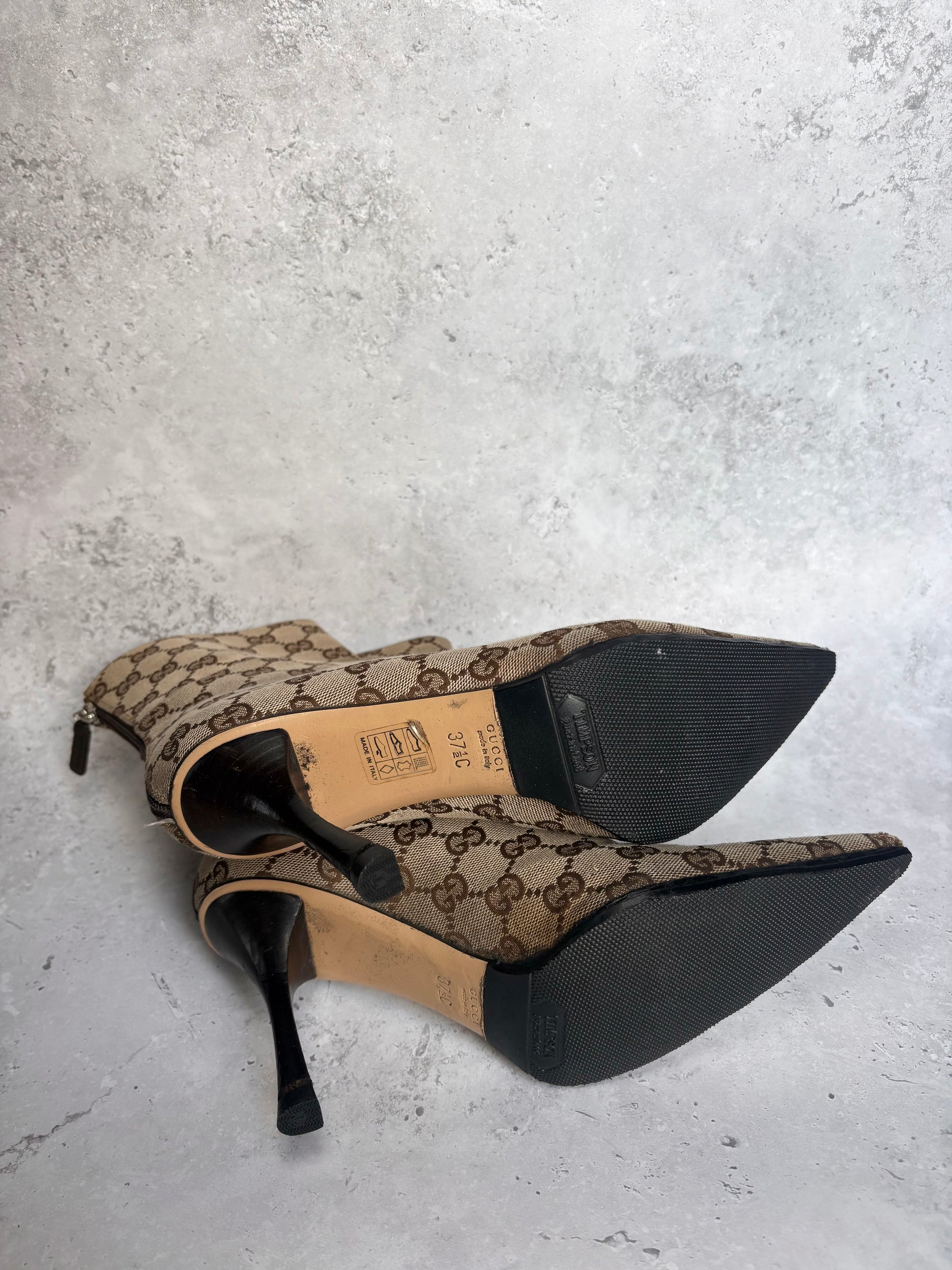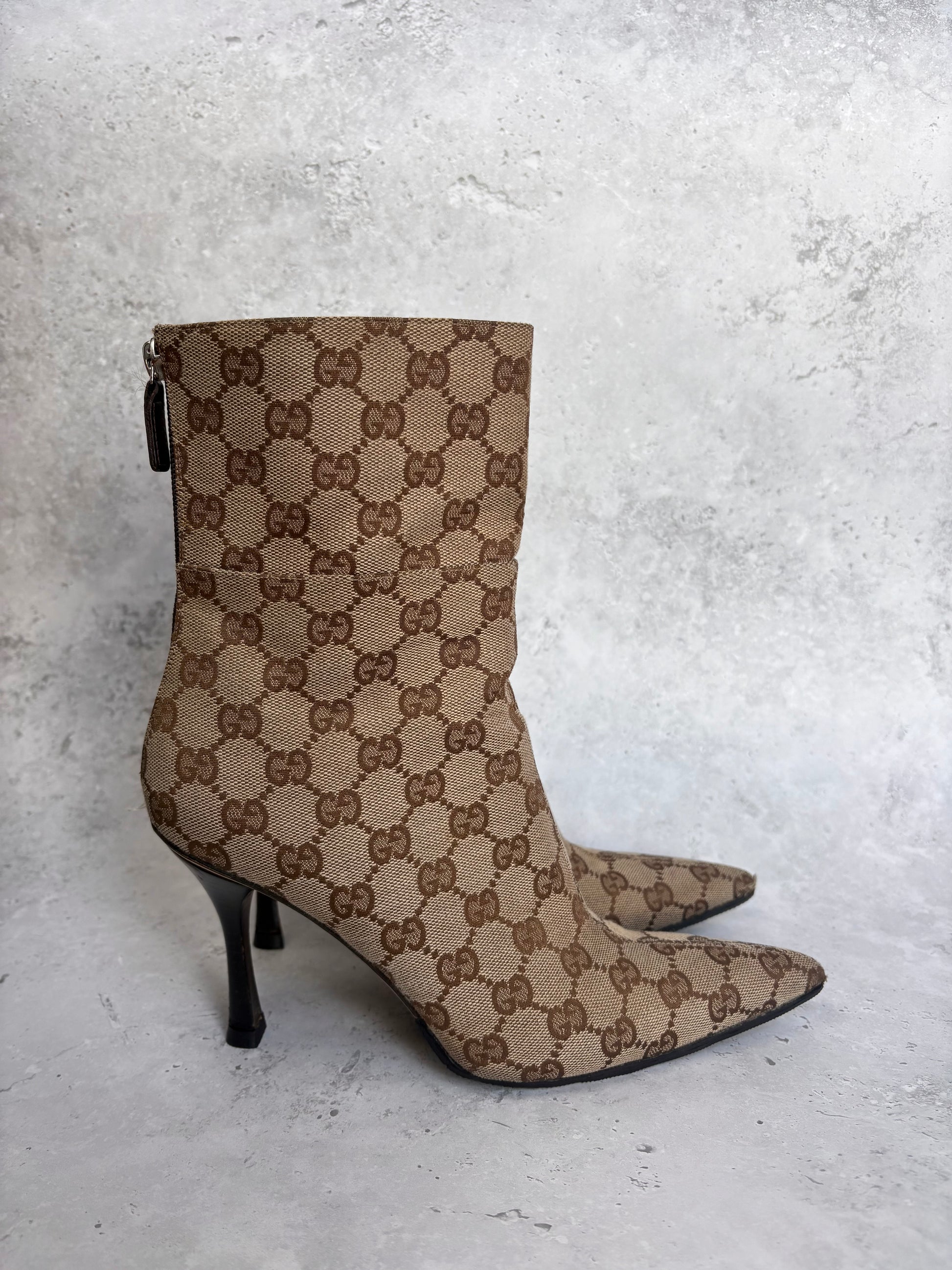 Vintage Gucci canvas ankle boots from the Tom Ford era with all over classic monogram logo. Back zip. Logo to interior and sole. Come with Le Comeback dustbag.