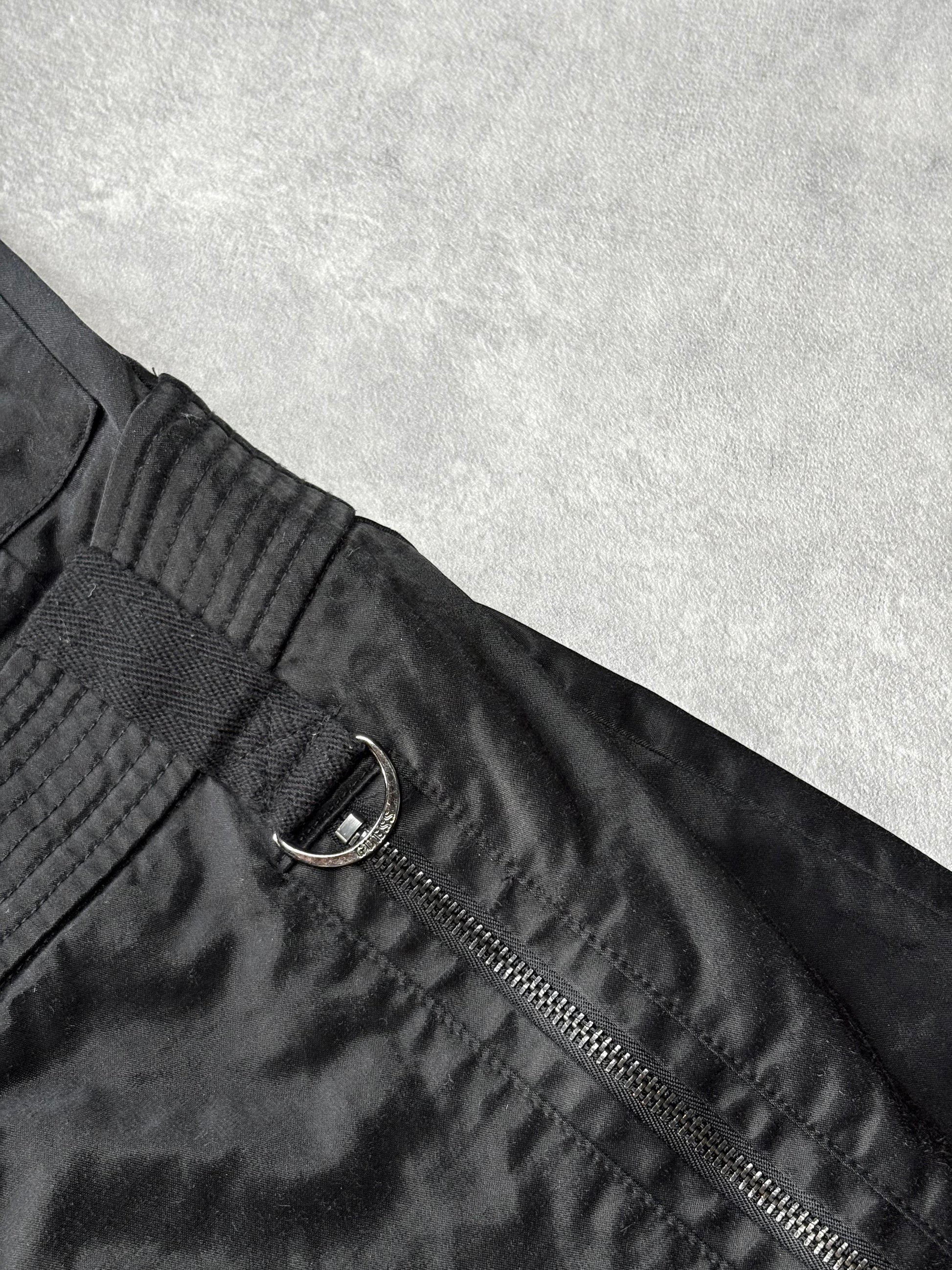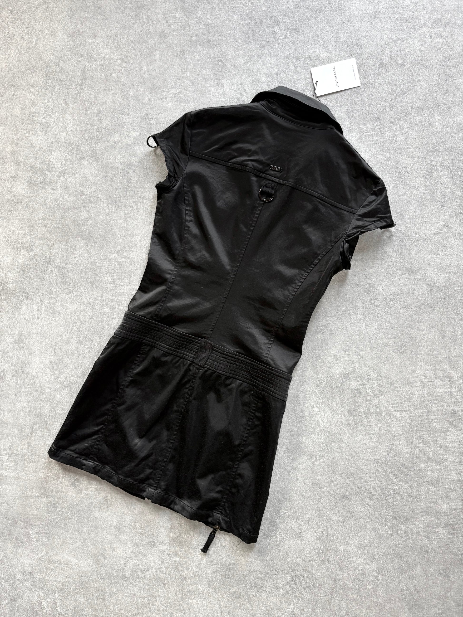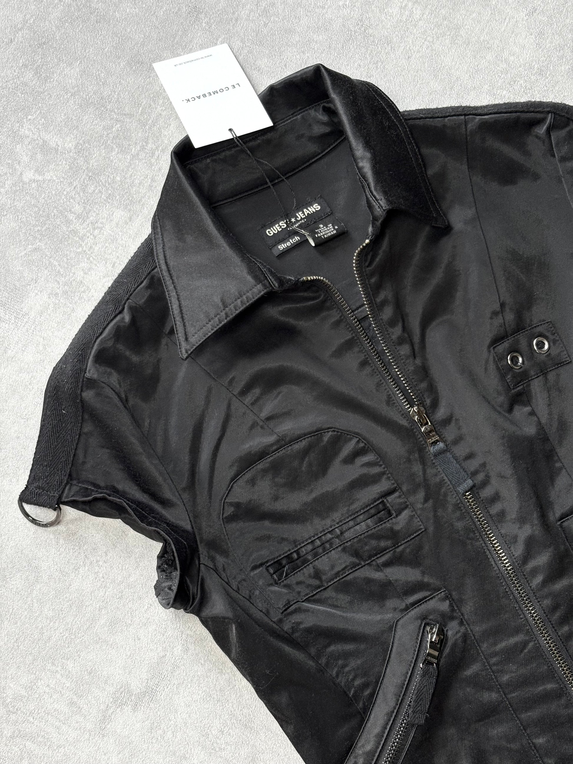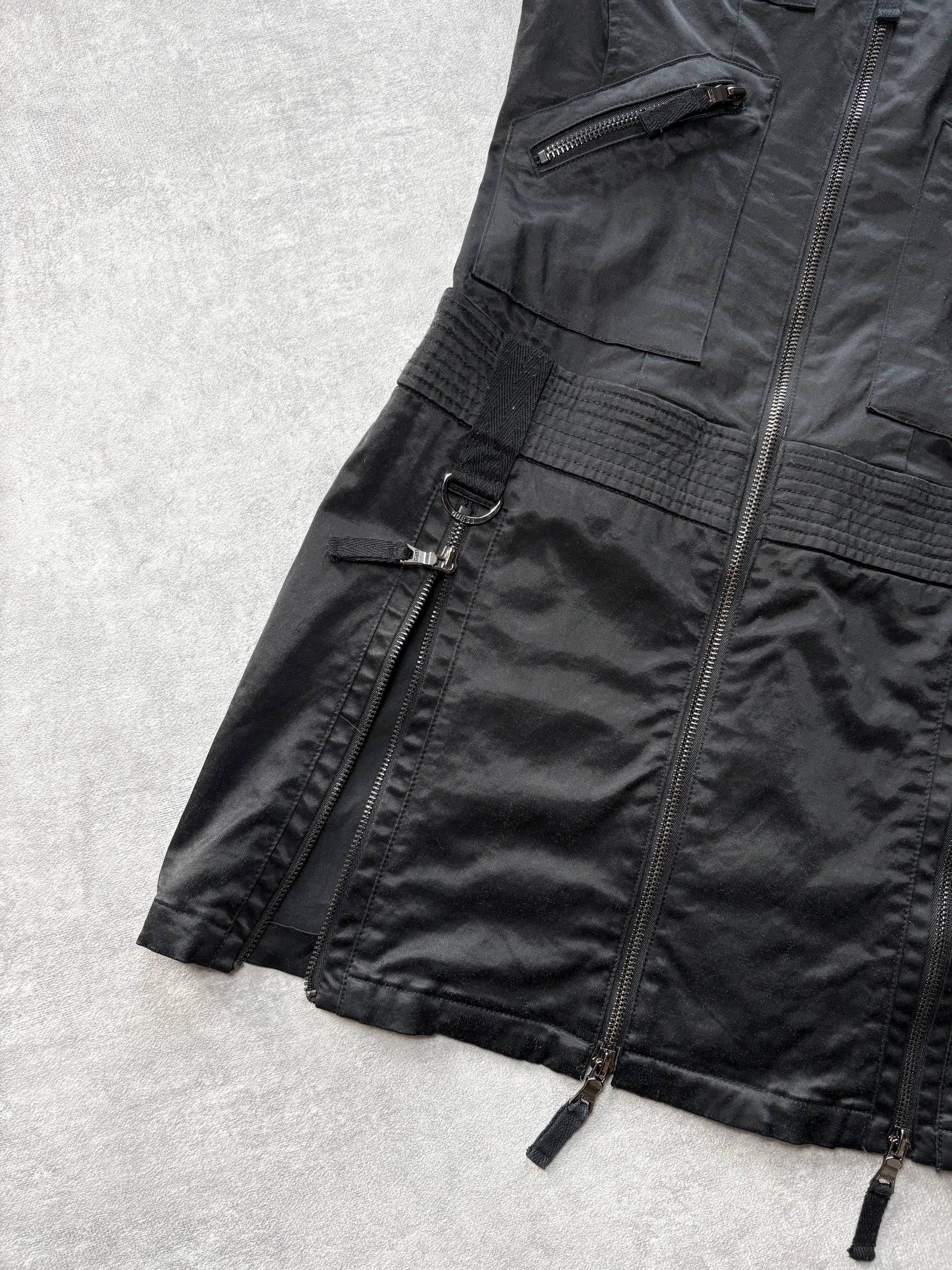 Vintage Guess utility mini dress with full length front zip. Double leg zips. Satin style fabric. Silver engraved hardware.