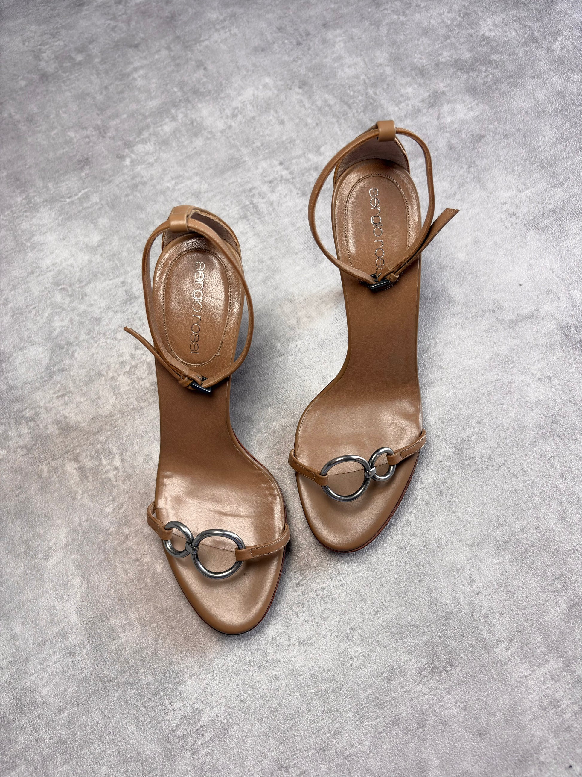 Sergio Rossi strappy heels with silver hardware details. Adjustable ankle strap. 100% leather. 4 inch heel and slight platform. Size 36/UK3. Come in original box.