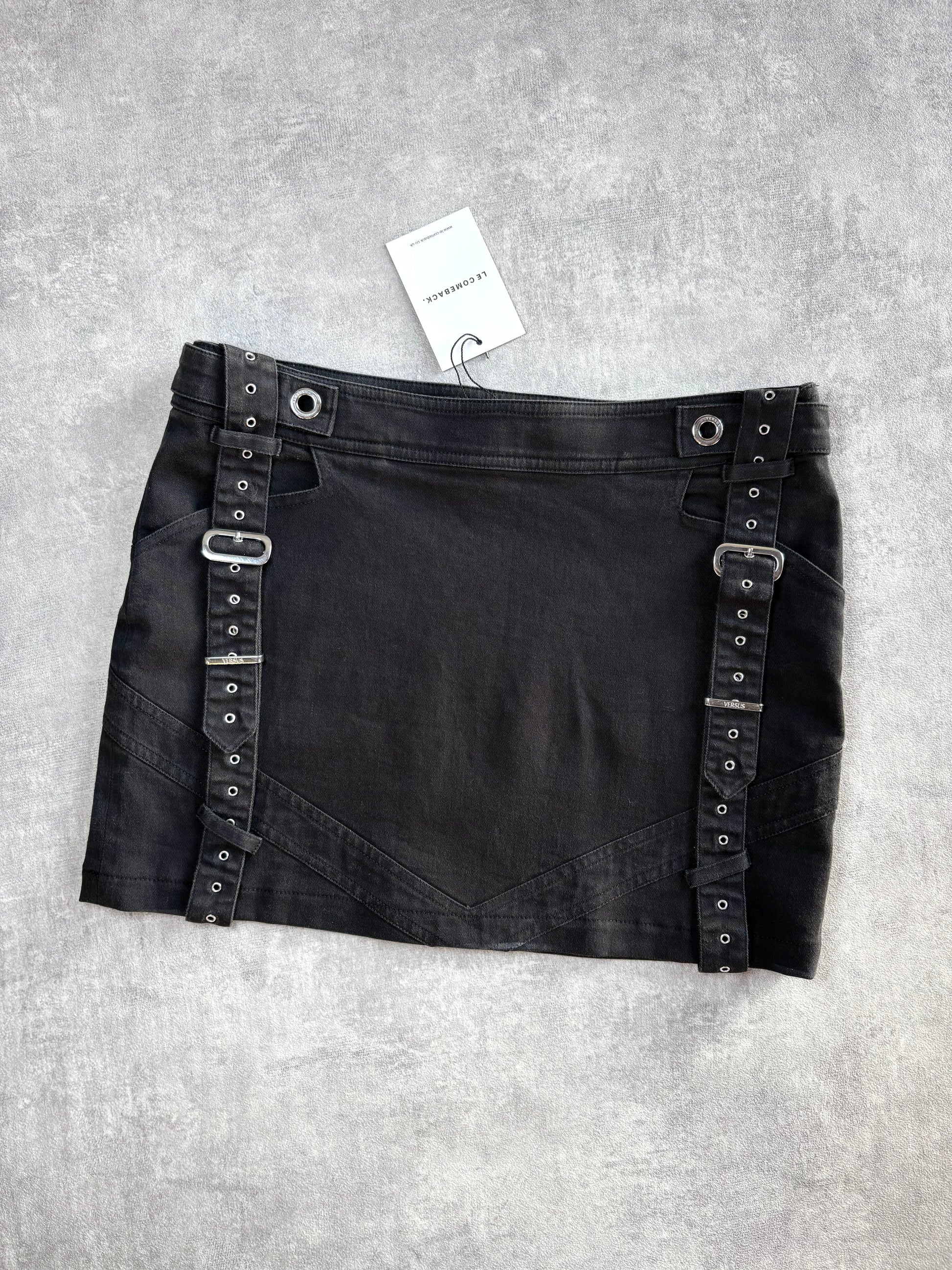 Versus Versace mini skirt with silver eyelet buckles. Silver engraved hardware. Low waisted fit.