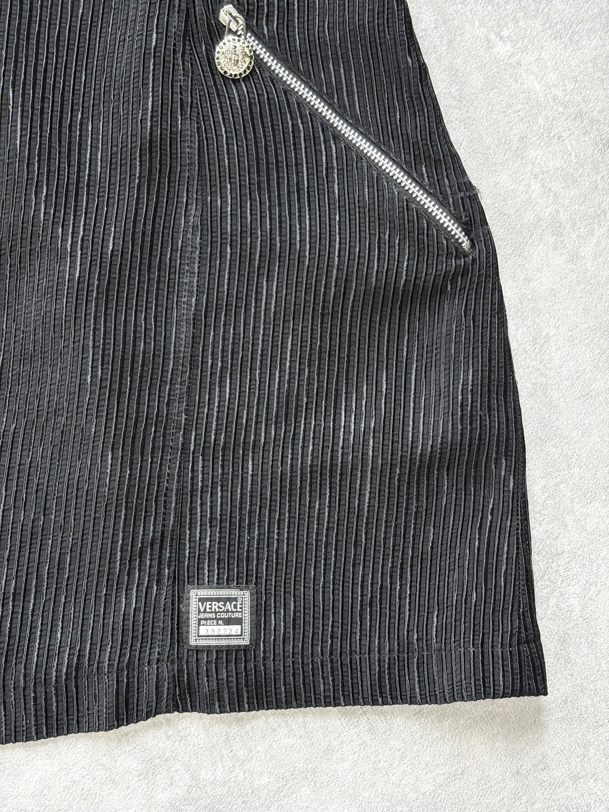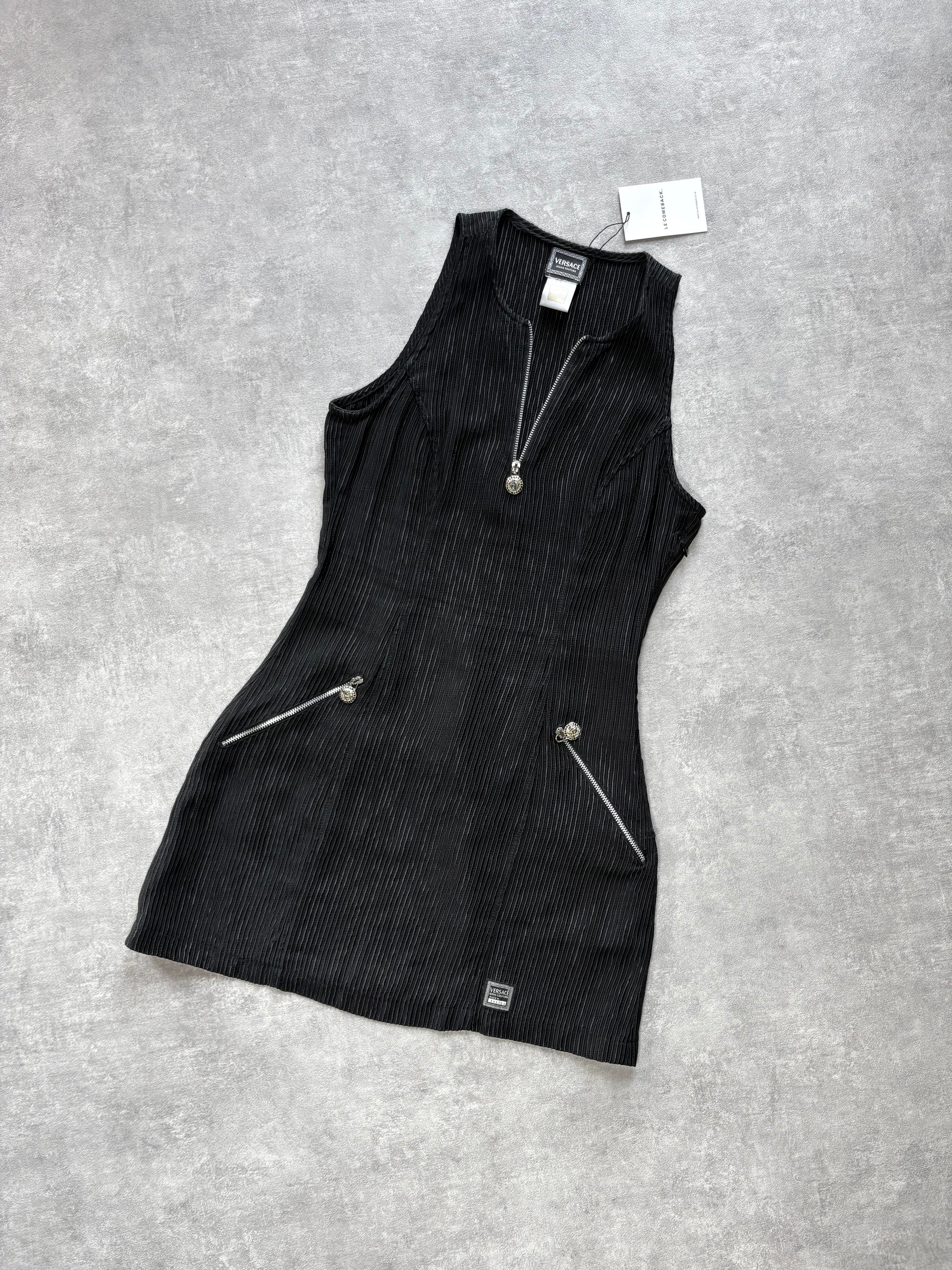 Vintage Versace mini dress with silver hardware details. Zip pulls with Medusa charms. Shimmering rib fabric. Side zip closure.